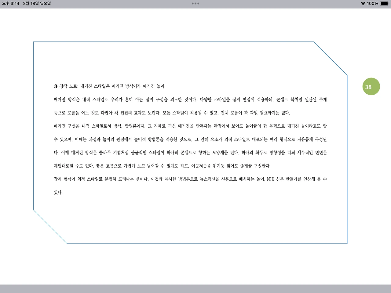 잡지 형식이 외적 스타일로 분명히 드러나는 셈이다. 이것과 유사한 방법론으로 뉴스픽션을 신문으로 배치하는 놀이, NIE 신문 만들기를 연상해 볼 수 있다.