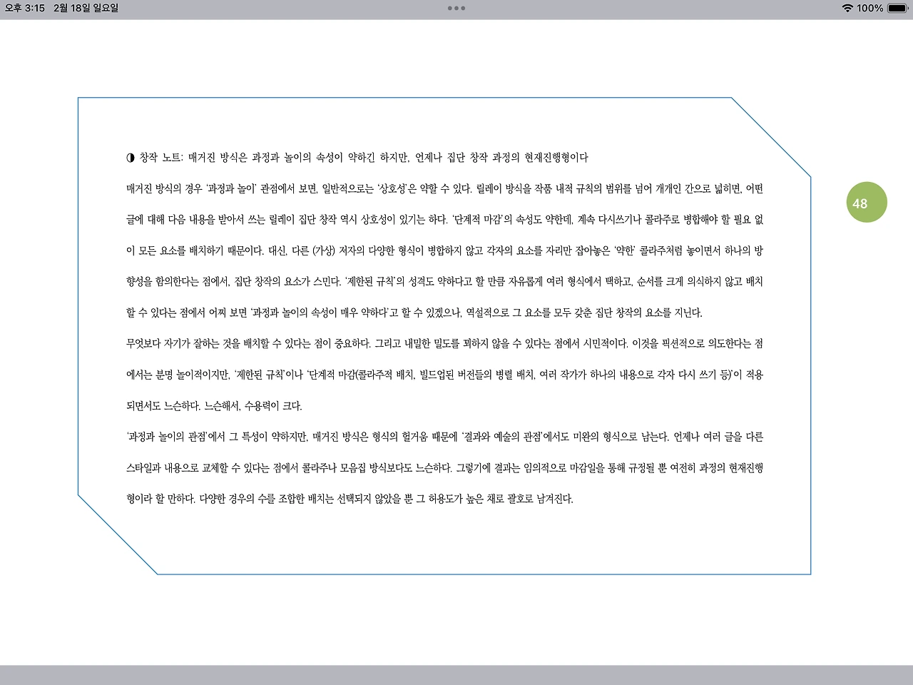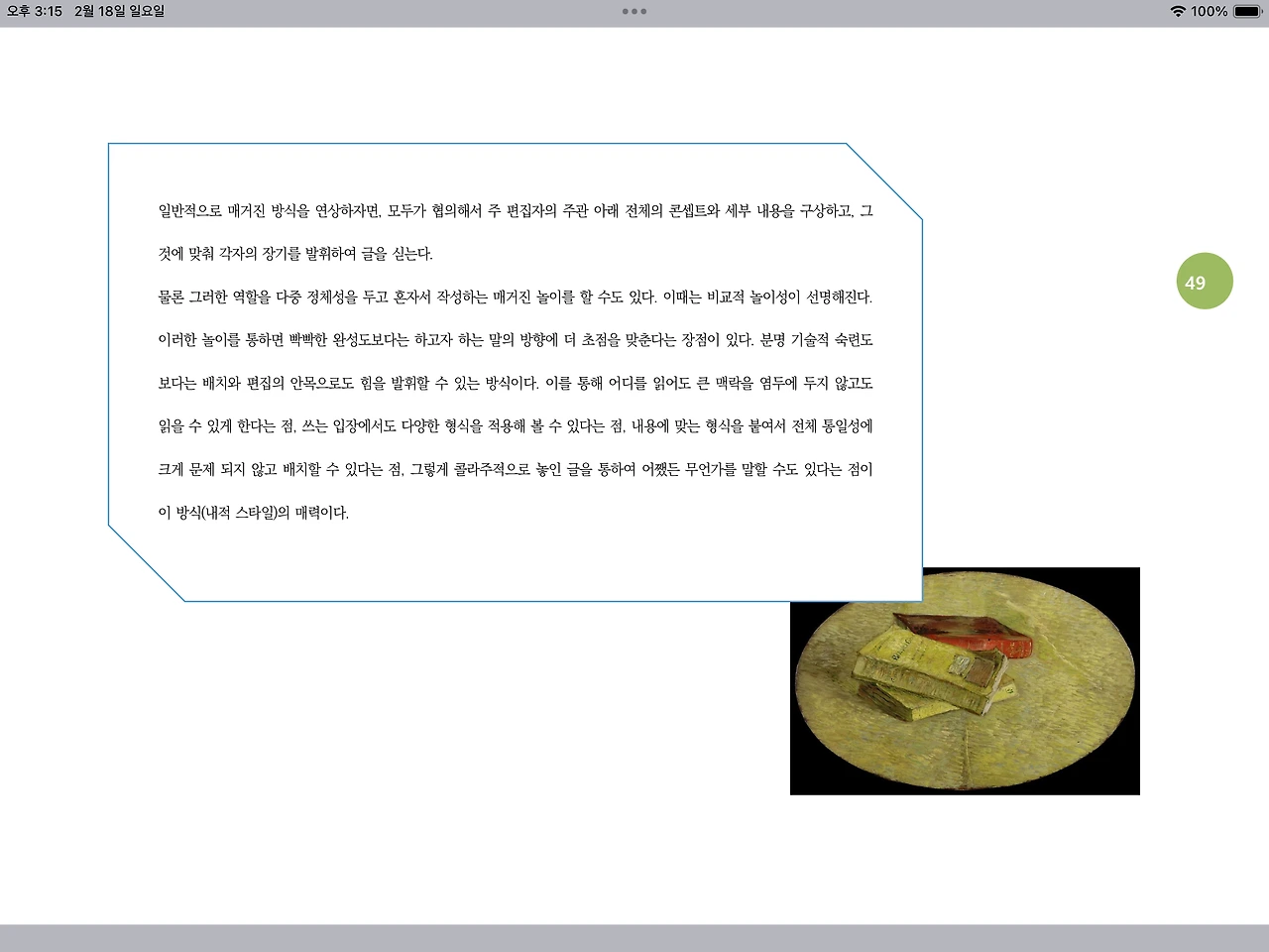 물론 그러한 역할을 다중 정체성을 두고 혼자서 작성하는 매거진 놀이를 할 수도 있다. 이때는 비교적 놀이성이 선명해진다. 이러한 놀이를 통하면 빡빡한 완성도보다는 하고자 하는 말의 방향에 더 초점을 맞춘다는 장점이 있다. 분명 기술적 숙련도보다는 배치와 편집의 안목으로도 힘을 발휘할 수 있는 방식이다. 이를 통해 어디를 읽어도 큰 맥락을 염두에 두지 않고도 읽을 수 있게 한다는 점, 쓰는 입장에서도 다양한 형식을 적용해 볼 수 있다는 점, 내용에 맞는 형식을 붙여서 전체 통일성에 크게 문제 되지 않고 배치할 수 있다는 점, 그렇게 콜라주적으로 놓인 글을 통하여 어쨌든 무언가를 말할 수도 있다는 점이 이 방식(내적 스타일)의 매력이다.