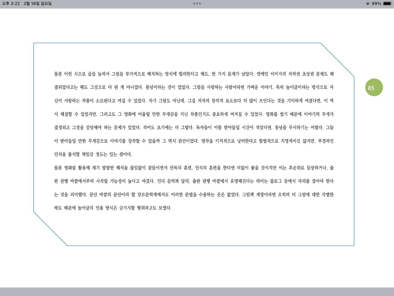 물론 명화를 활용해 재기 발랄한 해석을 끊임없이 곁들이면서 안목의 훈련, 인식의 훈련을 한다면 더없이 좋을 것이지만 이는 후순위로 등장하거나, 출판 관행 바깥에서부터 시작될 가능성이 높다고 여겼다. 인디 음악과 달리, 출판 관행 바깥에서 유명해진다는 의미는 블로그 등에서 자리를 잡아야 한다는 것을 의미했다. 문단 바깥의 문단이라 할 장르문학계에서도 이러한 문법을 수용하는 곳은 없었다. 그림책 계열이라면 오히려 더 그림에 대한 각별한 태도 때문에 놀이글의 인용 방식은 금기시할 행위라고도 보였다.