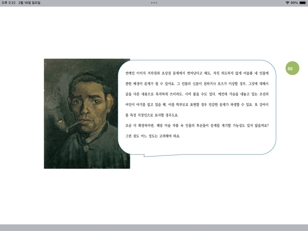 “연예인 이미지 저작권과 초상권 문제에서 벗어난다고 해도, 자칫 의도하지 않게 미술품 내 인물에 관한 배경이 문제가 될 수 있어요. 그 인물의 신분이 천하거나 포즈가 이상할 경우, 그것에 대해서 글을 다른 내용으로 묵직하게 쓰더라도, 시비 붙을 수도 있어요. 예컨대 가슴을 내놓고 있는 조선의 여인이 아기를 엎고 있을 때, 이를 학부모로 표현할 경우 민감한 문제가 파생할 수 있죠. 또 강아지를 특정 직장인으로 묘사할 경우도요.