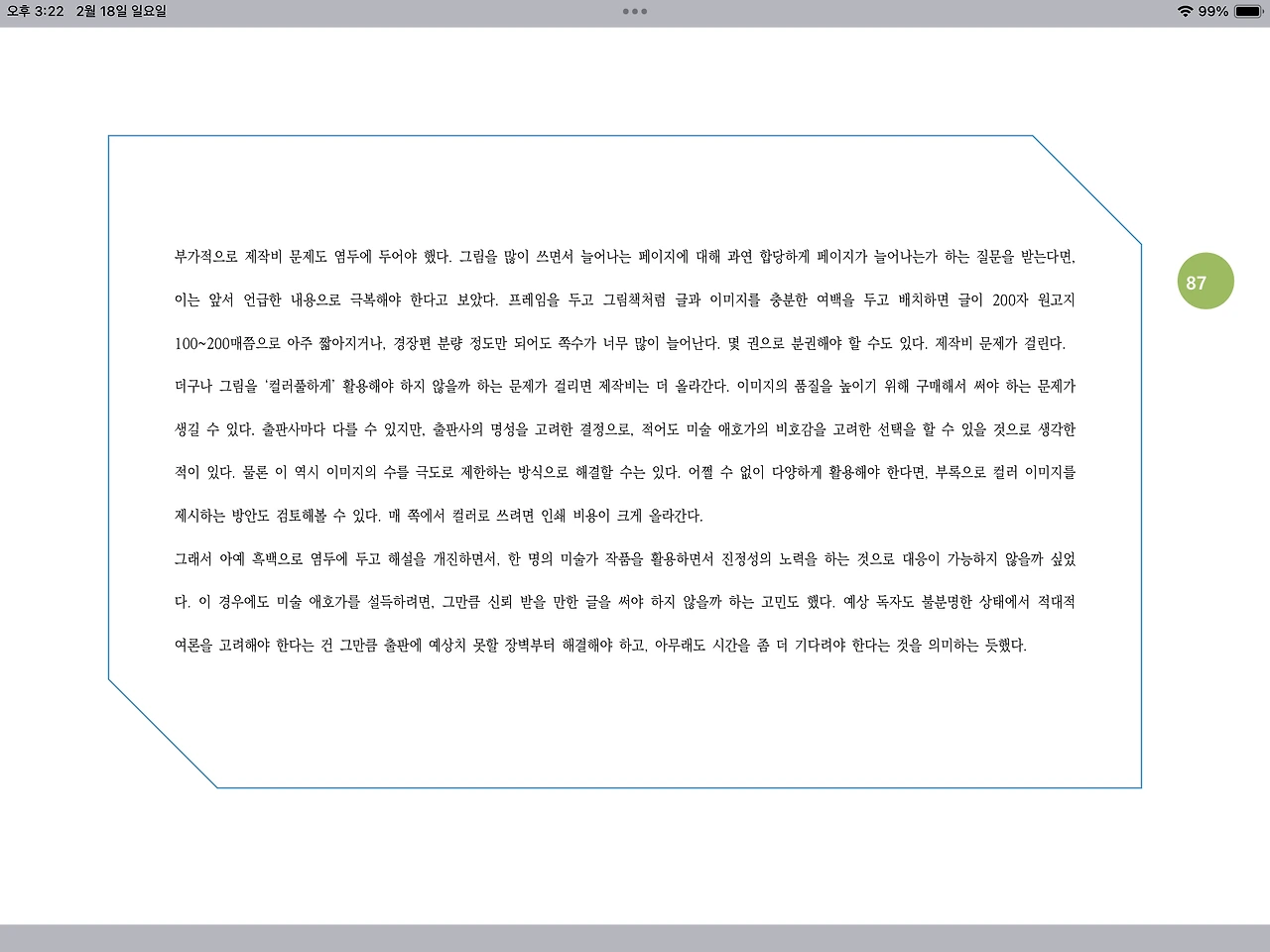 부가적으로 제작비 문제도 염두에 두어야 했다. 그림을 많이 쓰면서 늘어나는 페이지에 대해 과연 합당하게 페이지가 늘어나는가 하는 질문을 받는다면, 이는 앞서 언급한 내용으로 극복해야 한다고 보았다. 프레임을 두고 그림책처럼 글과 이미지를 충분한 여백을 두고 배치하면 글이 200자 원고지 100~200매쯤으로 아주 짧아지거나, 경장편 분량 정도만 되어도 쪽수가 너무 많이 늘어난다. 몇 권으로 분권해야 할 수도 있다. 제작비 문제가 걸린다.