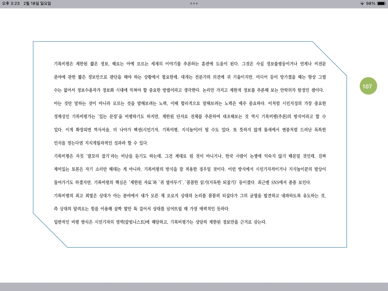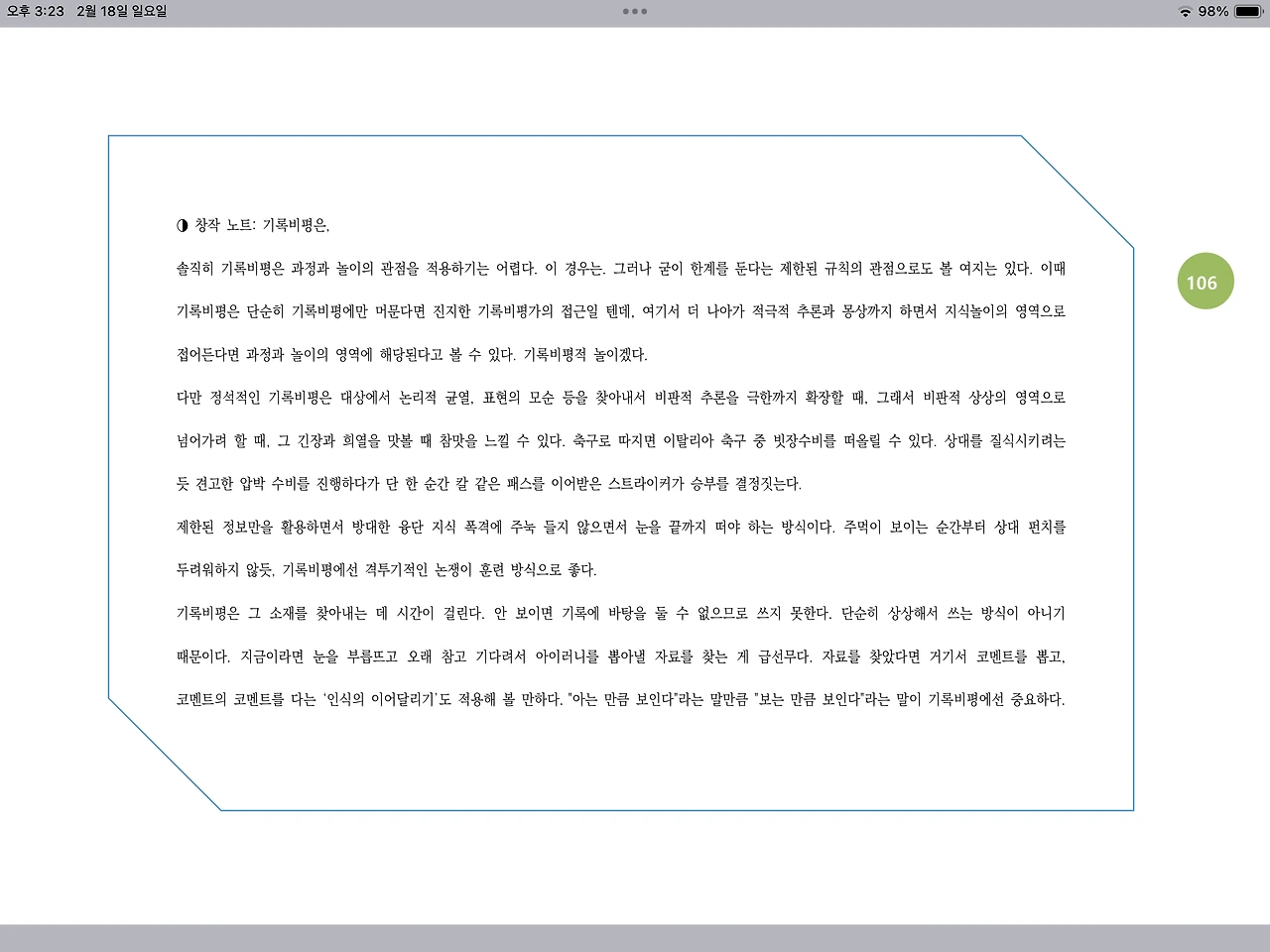 제한된 정보만을 활용하면서 방대한 융단 지식 폭격에 주눅 들지 않으면서 눈을 끝까지 떠야 하는 방식이다. 주먹이 보이는 순간부터 상대 펀치를 두려워하지 않듯, 기록비평에선 격투기적인 논쟁이 훈련 방식으로 좋다.