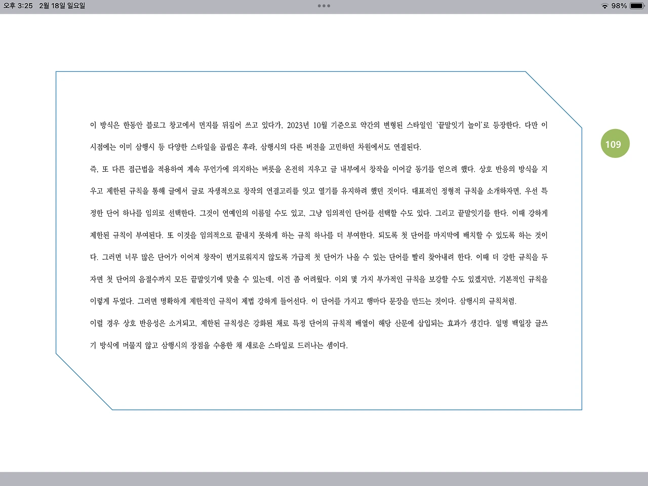 이럴 경우 상호 반응성은 소거되고, 제한된 규칙성은 강화된 채로 특정 단어의 규칙적 배열이 해당 산문에 삽입되는 효과가 생긴다. 일명 백일장 글쓰기 방식에 머물지 않고 삼행시의 장점을 수용한 채 새로운 스타일로 드러나는 셈이다.