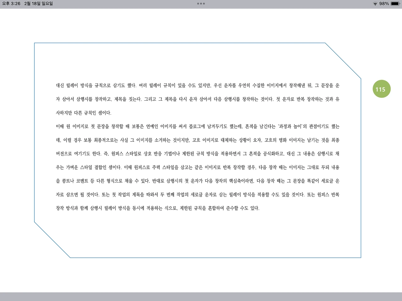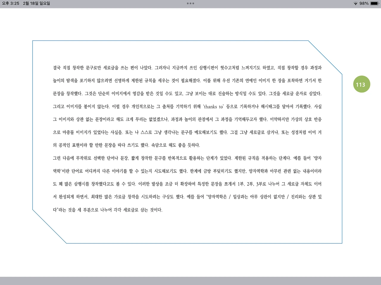 이런 상황이다 보니, 제한된 규칙을 너무 까다롭게 둘 경우 진도가 잘 나가지 않아 금방 시큰둥해졌다. 스토리를 이어서 삼행시를 연작해보려고도 했으나, 이 역시 운자의 우연성을 장악하면서 내용을 일관되게 끌어내야 한다는 점에서 고난도에 속하는 작업이었다. 언젠가 다시 시도해 보고 싶지만, 일단은 후순위로 미뤘다.