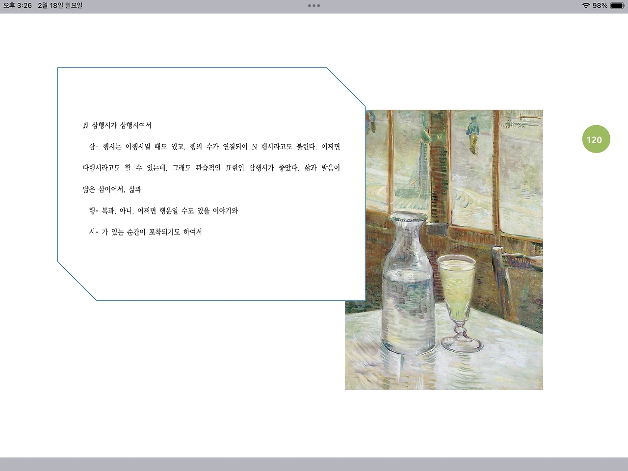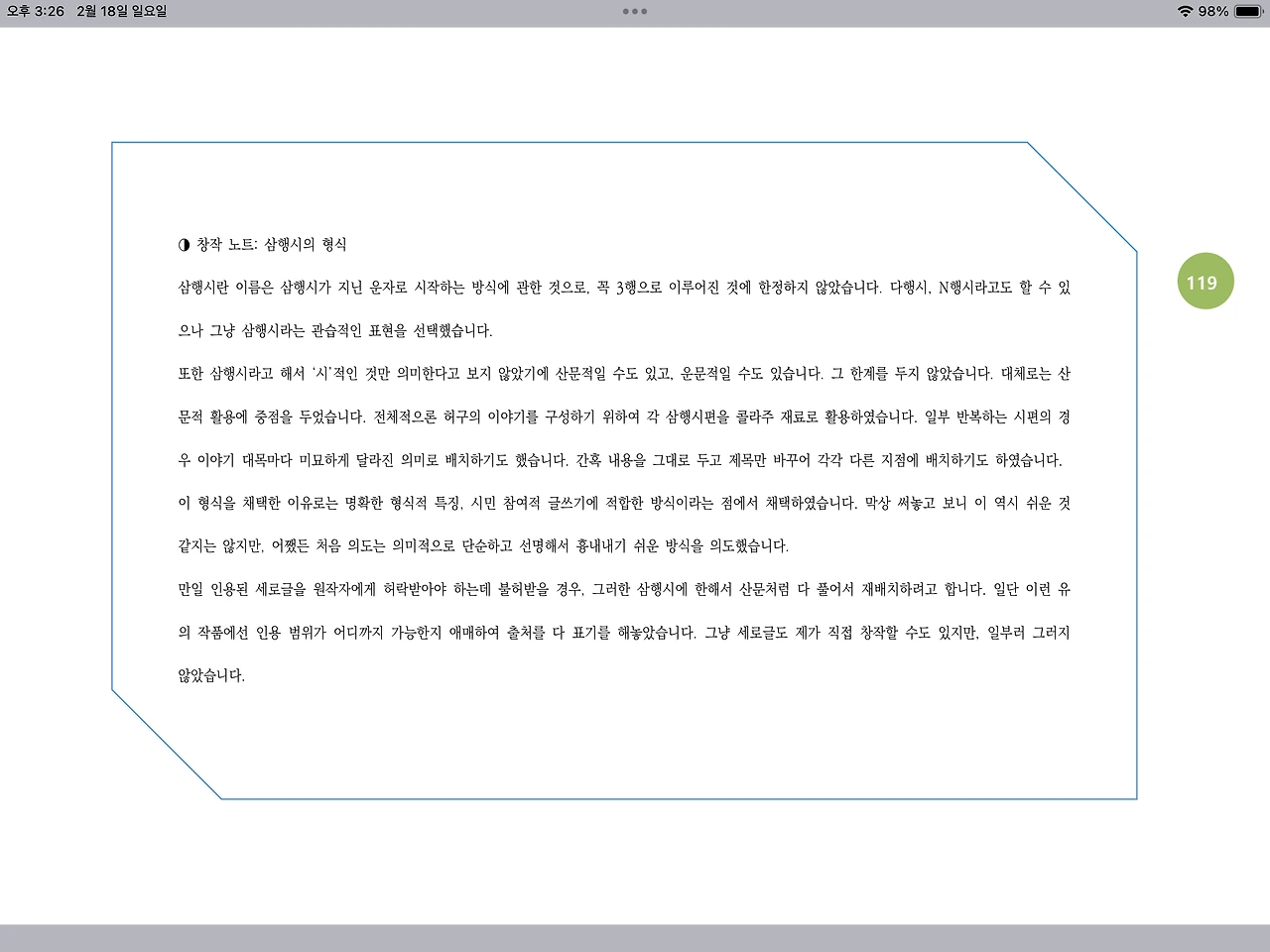 이 형식을 채택한 이유로는 명확한 형식적 특징, 시민 참여적 글쓰기에 적합한 방식이라는 점에서 채택하였습니다. 막상 써놓고 보니 이 역시 쉬운 것 같지는 않지만, 어쨌든 처음 의도는 의미적으로 단순하고 선명해서 흉내내기 쉬운 방식을 의도했습니다.