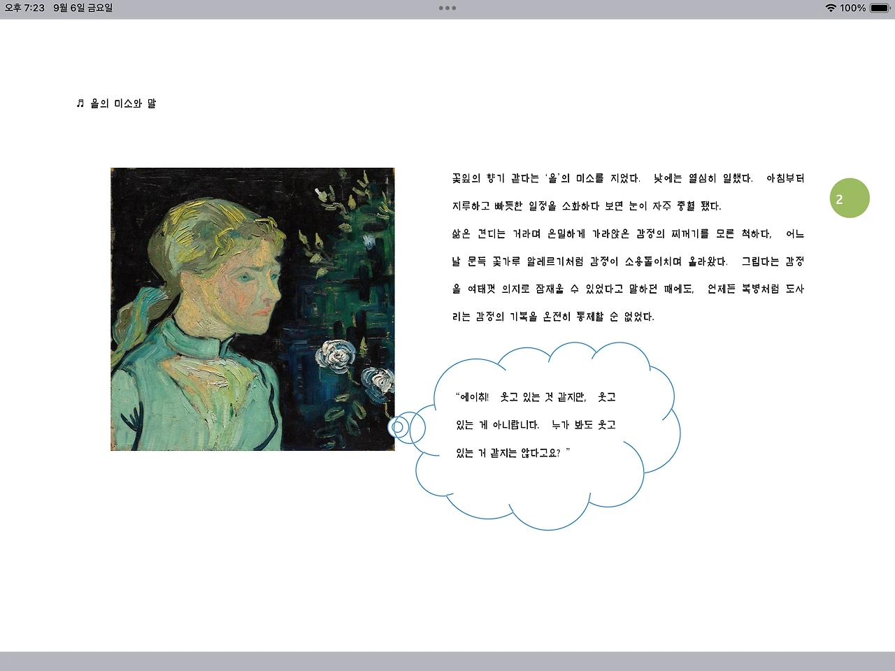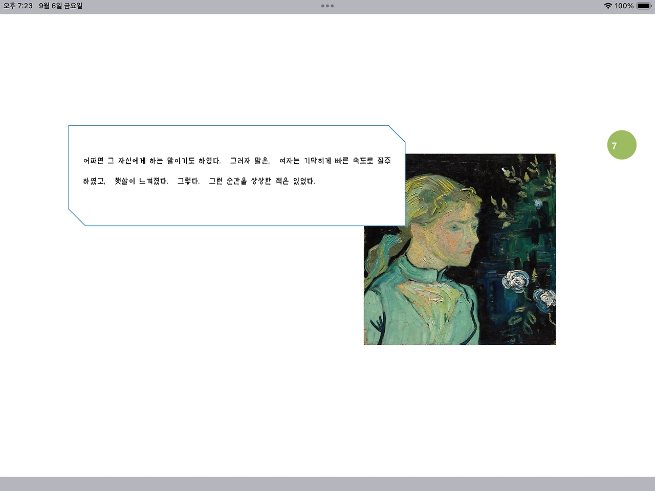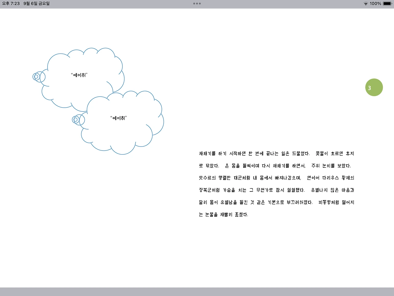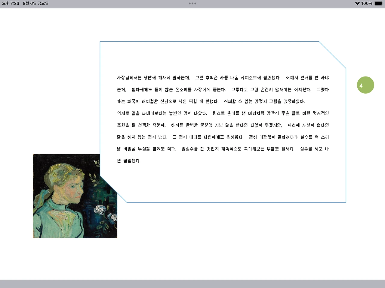 사장님께서는 낭만에 대하여 말하는데, 그런 추억은 하품 나올 에피소드에 불과했다. 어째서 연애를 안 하냐는데, 엄마에게도 듣지 않는 잔소리를 사장에게 듣는다. 그렇다고 그걸 온전히 말하기는 어려웠다. 그랬다가는 파국의 래디컬한 신념으로 낙인 찍힐 게 뻔했다. 어찌할 수 없는 감정의 고립을 감당하였다.