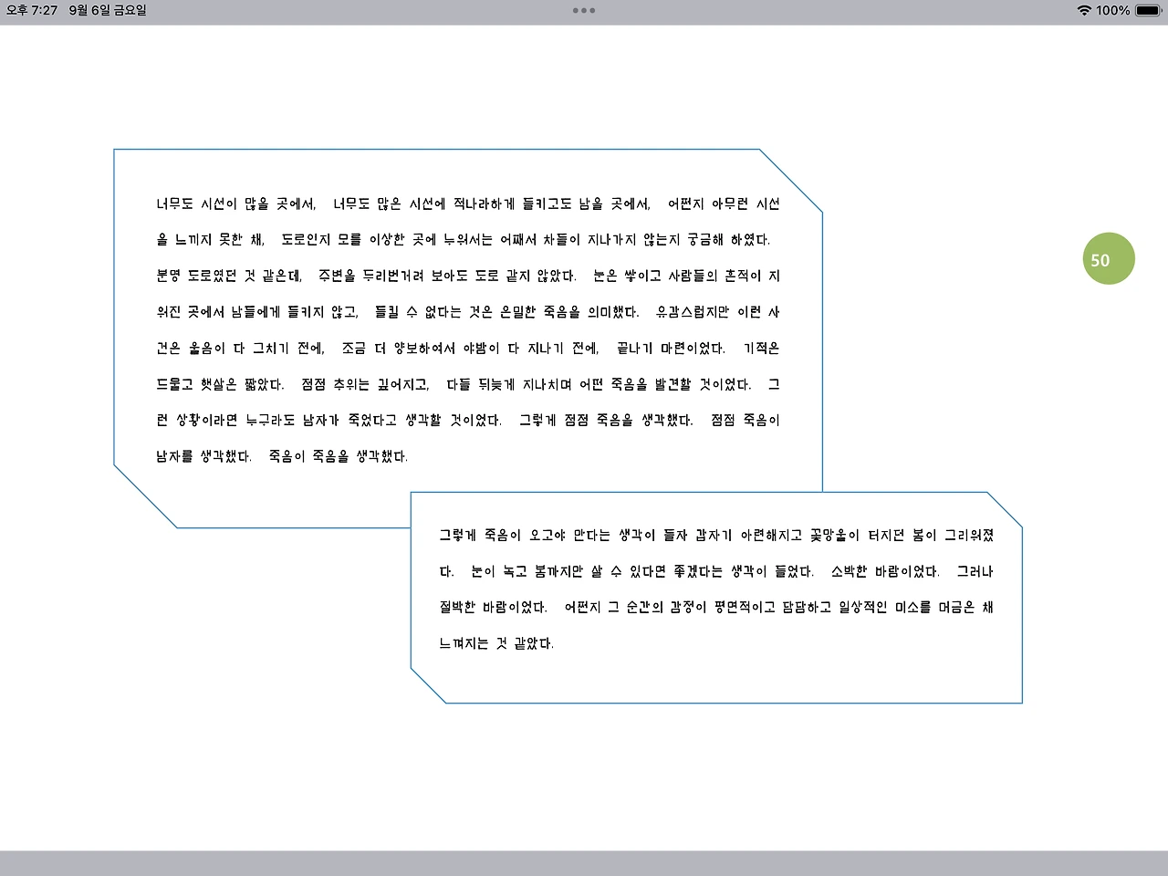 그렇게 죽음이 오고야 만다는 생각이 들자 갑자기 아련해지고 꽃망울이 터지던 봄이 그리워졌다. 눈이 녹고 봄까지만 살 수 있다면 좋겠다는 생각이 들었다. 소박한 바람이었다. 그러나 절박한 바람이었다. 어쩐지 그 순간의 감정이 평면적이고 담담하고 일상적인 미소를 머금은 채 느껴지는 것 같았다.