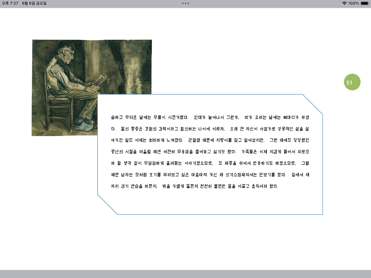 습하고 무더운 날에는 무릎이 시큰거렸다. 인대가 늘어나서 그런가, 비가 오려는 날에는 뼈마디가 쑤셨다. 몸의 통증은 경험의 과학이라고 합의하는 나이에 이르자, 오래 전 자신이 사업가로 성공적인 삶을 살아가던 일도 이제는 희미하게 느껴졌다. 관절염 때문에 지팡이를 짚고 일어섰지만, 그런 때에도 당당했던 중년의 시절을 떠올릴 때면 여전히 무용담을 풀어놓고 싶기도 했다. 가족들은 이제 지겹게 들어서 위로조차 할 생각 없이 무덤덤하게 흘려듣는 이야기였으므로, 또 짜증을 섞어서 반응하기도 하였으므로, 그럴 때면 남자는 모처럼 호기를 부려보고 싶은 마음마저 가신 채 의기소침해져서는 만보기를 찼다. 집에서 제자리 걷기 연습을 하든지, 밖을 가볍게 돌든지 천천히 불편한 몸을 이끌고 움직이려 했다.