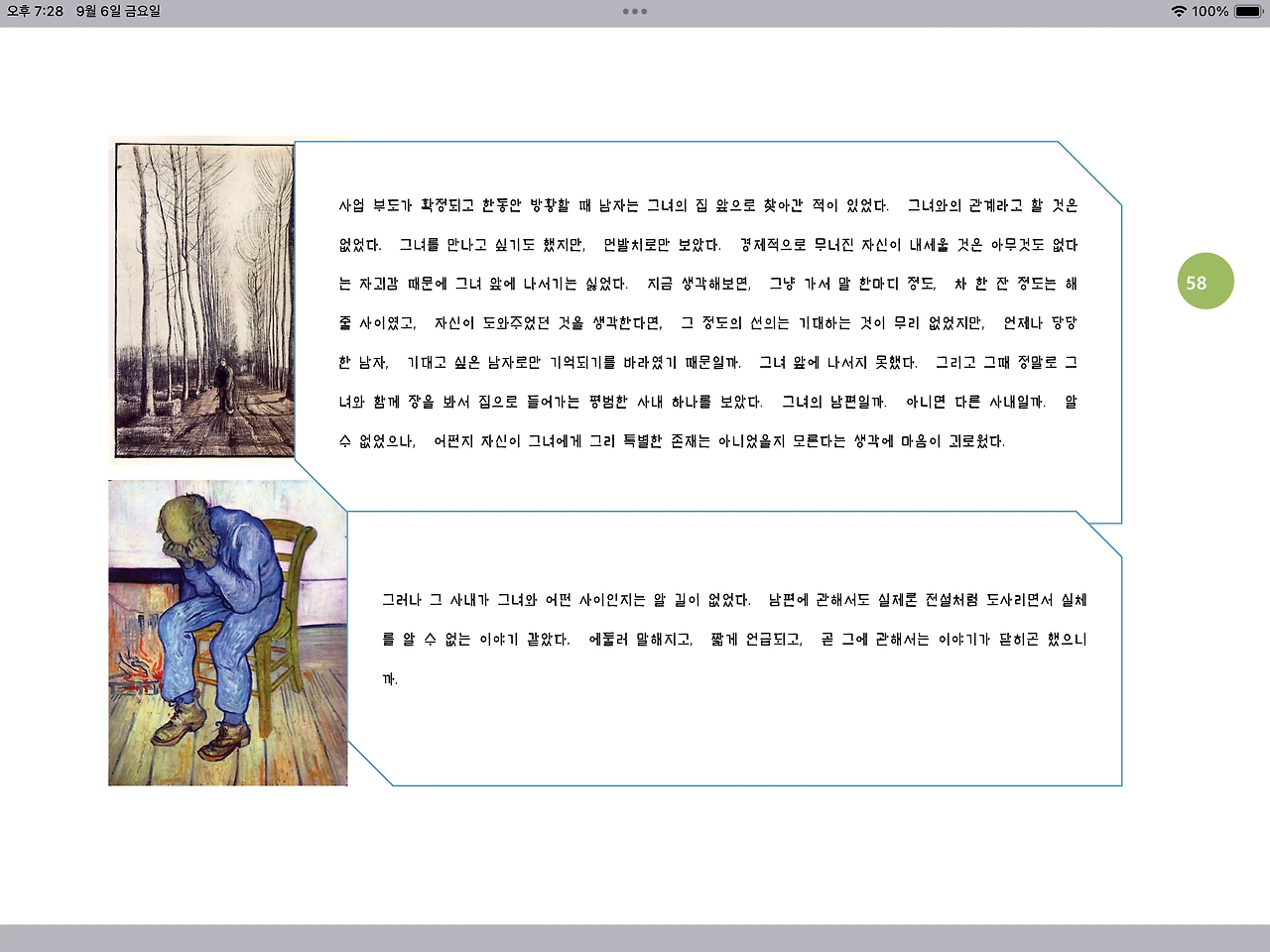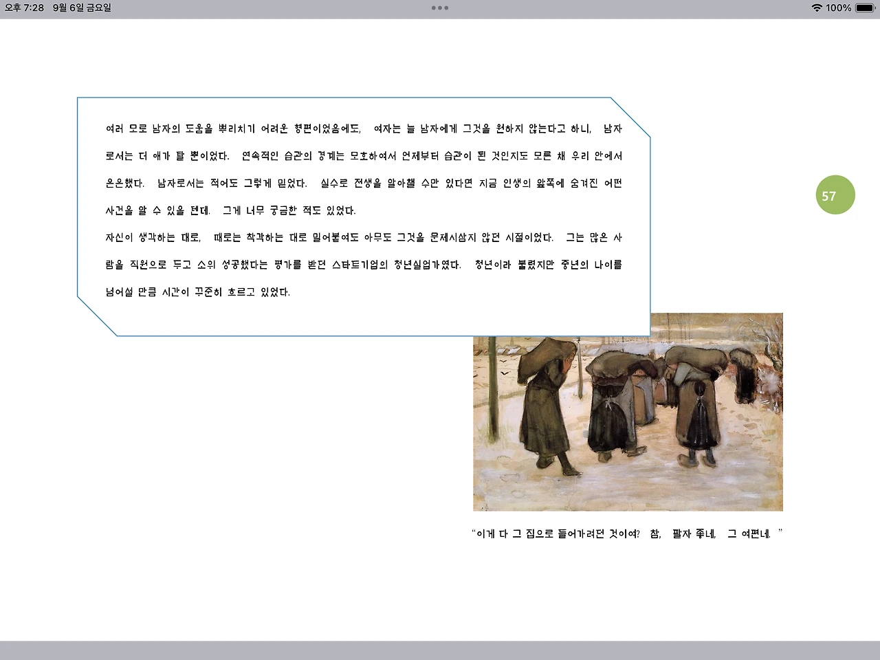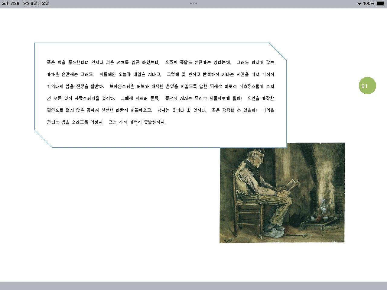 경제적 능력이 취약해졌을 나이에 이르자 호기롭던 기운도 다 옛말. 그때의 한 순간에 모두 증발한 듯했고, 몇 번의 시도를 했으나, 운이란 늘 그때에만 있는 것 같았다. 그렇게 점점 현실의 벽에 부딪혀 언제 그렇게 성공하던 적이 있었던가 싶다. 계량기 돌아가는 소리에도 민감해졌고, 하여튼 아직 여력이 남아 있는 것을 감사해야 할지 딱히 알 수 없었다. 그럼에도 말뿐인 여생이란 단어를 접어두고 밤마다 차갑게 어두워지는 것은 싫었다. 영영 고립되는 것도 싫었다. 은둔자의 삶으로 스스로를 규정하고 싶지 않았다. 서서히 유채꽃밭으로 자신의 삶을 묻어두는 준비를 하고 싶지도 않았다. 어찌보면 마지막 로망을 선택할 수 있기를 바랐다. 여전히 해처럼 매일 뜨기를 바랐다.