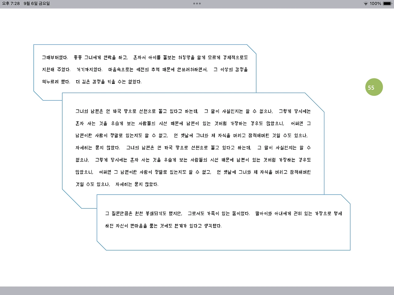 그녀의 남편은 먼 타국 땅으로 선원으로 돌고 있다고 하는데, 그 말이 사실인지는 알 수 없으나, 그렇게 당시에는 혼자 사는 것을 우습게 보는 사람들의 시선 때문에 남편이 있는 것처럼 가장하는 경우도 많았으니, 어쩌면 그 남편이란 사람이 정말로 있는지도 알 수 없고, 먼 옛날에 그녀와 제 자식을 버리고 잠적해버린 것일 수도 있으나, 자세히는 묻지 않았다. 그녀의 남편은 먼 타국 땅으로 선원으로 돌고 있다고 하는데, 그 말이 사실인지는 알 수 없으나, 그렇게 당시에는 혼자 사는 것을 우습게 보는 사람들의 시선 때문에 남편이 있는 것처럼 가장하는 경우도 많았으니, 어쩌면 그 남편이란 사람이 정말로 있는지도 알 수 없고, 먼 옛날에 그녀와 제 자식을 버리고 잠적해버린 것일 수도 있으나, 자세히는 묻지 않았다.