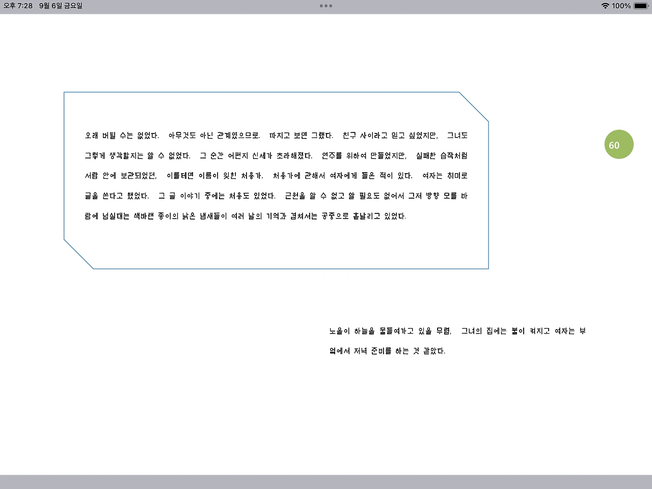 여러 모로 남자의 도움을 뿌리치기 어려운 형편이었음에도, 여자는 늘 남자에게 그것을 원하지 않는다고 하니, 남자로서는 더 애가 탈 뿐이었다. 연속적인 습관의 경계는 모호하여서 언제부터 습관이 된 것인지도 모른 채 우리 안에서 은은했다. 남자로서는 적어도 그렇게 믿었다. 실수로 전생을 알아챌 수만 있다면 지금 인생의 앞쪽에 숨겨진 어떤 사건을 알 수 있을 텐데. 그게 너무 궁금한 적도 있었다.