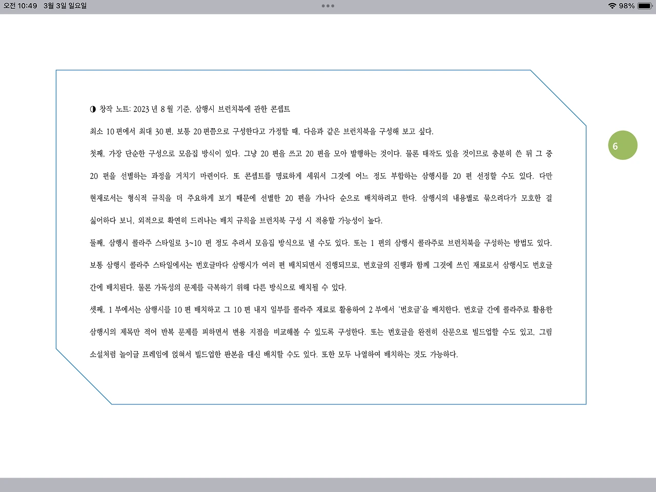 더구나 콜라주 기법으로 선별 기준에 관한 활로가 뚫리면서, 죽어 널브러진 줄 알았던 삼행시체들이 벌떡 일어서더군요. 좀비처럼 삐걱대는 것이 아니라, 정말 부활한 것처럼요. 탈락한 태작들이나 저작권 침해 소지가 있어 후순위로 미뤄두었던 삼행시편 등을 섞어서 다시금 재활용하는 방안도 함께 검토했죠. 콜라주 기법을 통해 빌드업 했던 것이죠. 당장 느슨한 작품이지만 그런 작품을 여럿 모아서 쓸 만한 다른 이야기로 재창작해보자는 심산이었어요. 이때 느슨한 작품도 콜라주로 추출한 산문인 번호글 간에 배치함으로써 어떻게 빌드업을 통해 첫 단계의 삼행시편이 되살아났는가 하는 점을 전시하고 싶었어요. 그게 삼행시 콜라주 형식이 되었죠. 또 어떤 경우는 삼행시 스타일을 고집하지 않고 콩트나 놀이글로 다시쓰기도 했어요. 산문으로 전환하기도 했고요. 다시쓰기를 통해 통째로 스타일 전환을 한 거죠.