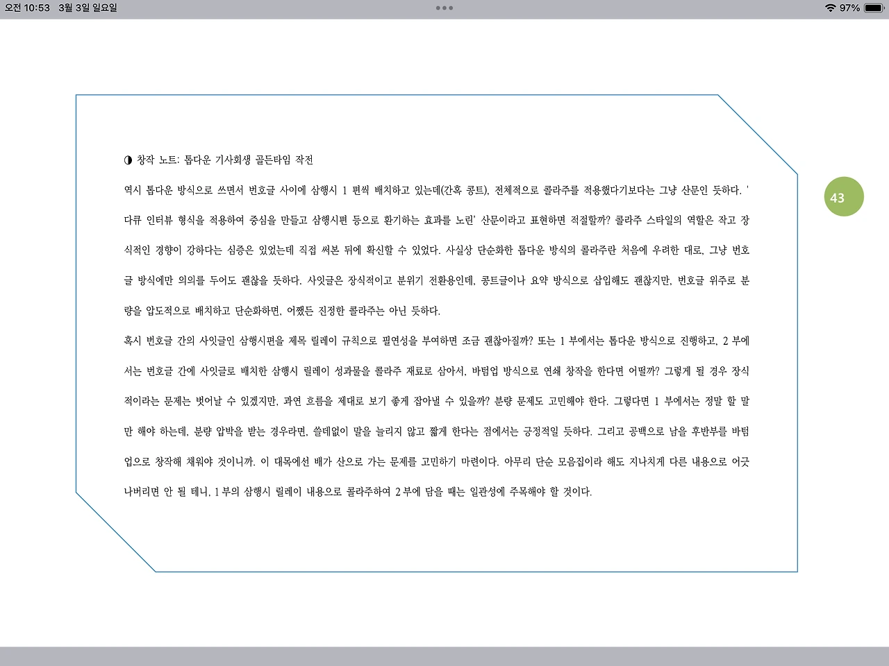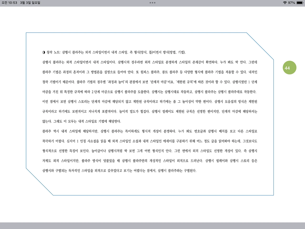 역시 톱다운 방식으로 쓰면서 번호글 사이에 삼행시 1편씩 배치하고 있는데(간혹 콩트), 전체적으로 콜라주를 적용했다기보다는 그냥 산문인 듯하다. '다큐 인터뷰 형식을 적용하여 중심을 만들고 삼행시편 등으로 환기하는 효과를 노린' 산문이라고 표현하면 적절할까? 콜라주 스타일의 역할은 작고 장식적인 경향이 강하다는 심증은 있었는데 직접 써본 뒤에 확신할 수 있었다. 사실상 단순화한 톱다운 방식의 콜라주란 처음에 우려한 대로, 그냥 번호글 방식에만 의의를 두어도 괜찮을 듯하다. 사잇글은 장식적이고 분위기 전환용인데, 콩트글이나 요약 방식으로 삽입해도 괜찮지만, 번호글 위주로 분량을 압도적으로 배치하고 단순화하면, 어쨌든 진정한 콜라주는 아닌 듯하다.
