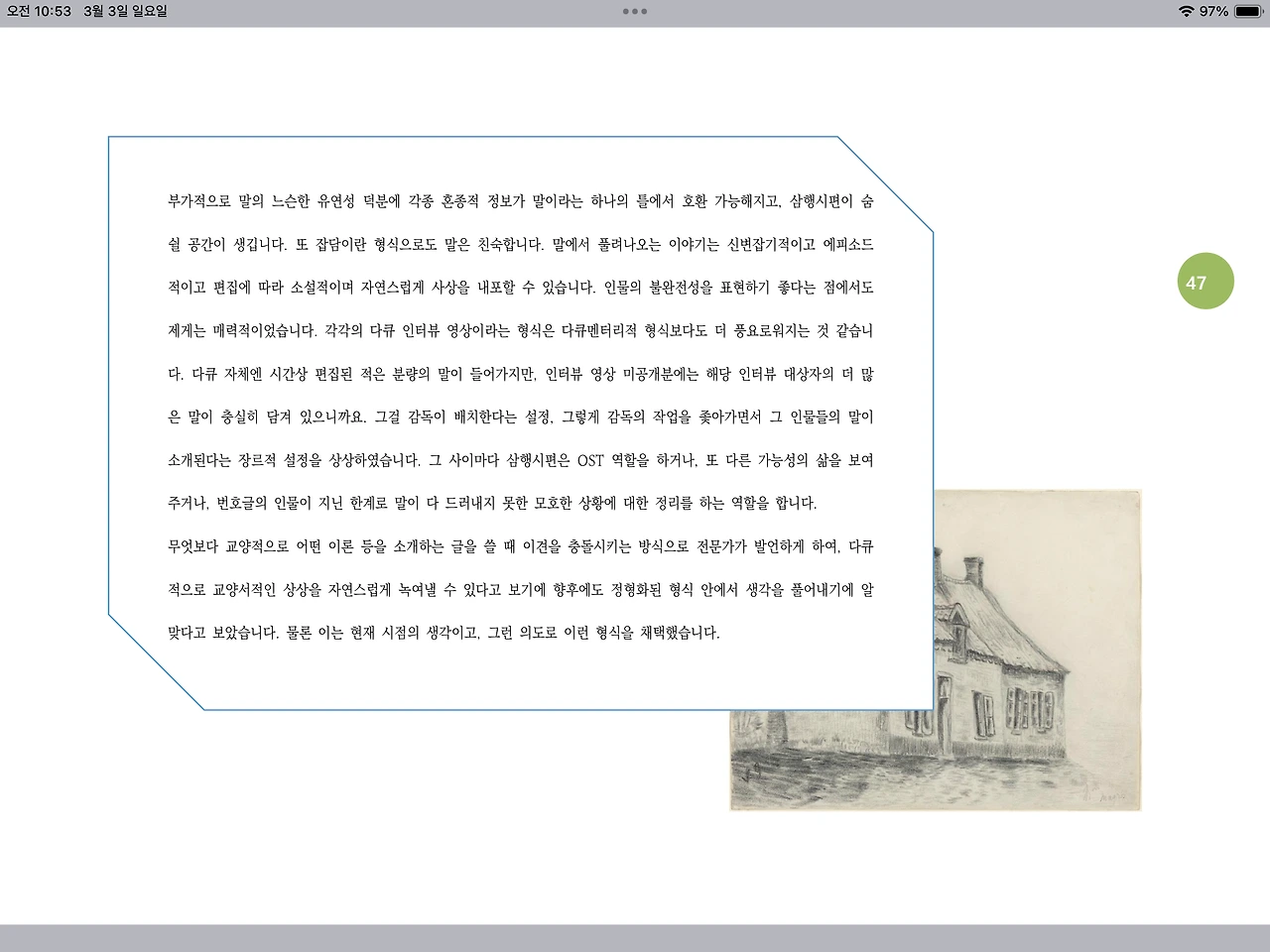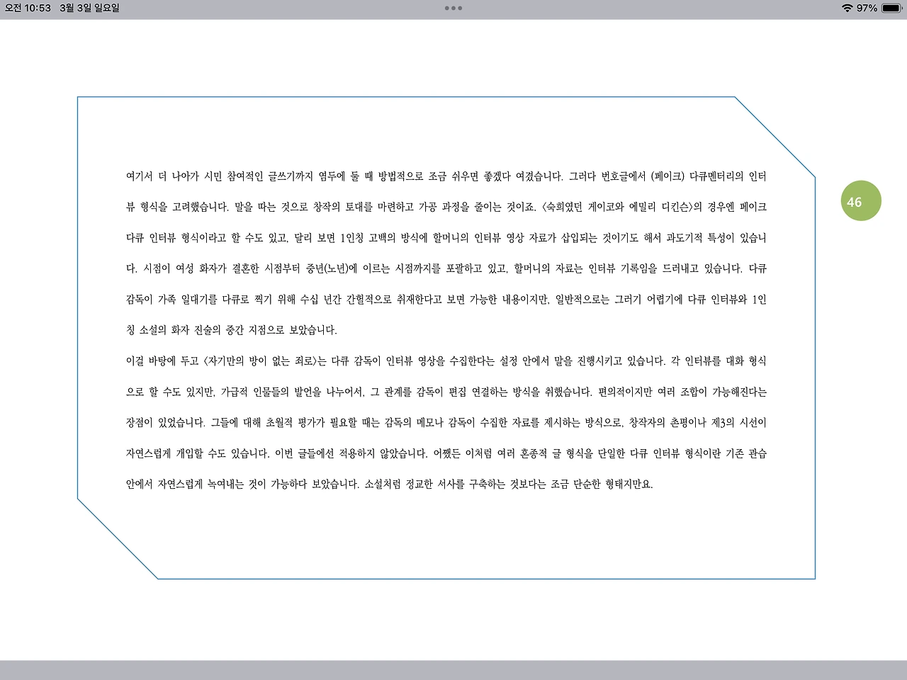 이걸 바탕에 두고 <자기만의 방이 없는 죄로>는 다큐 감독이 인터뷰 영상을 수집한다는 설정 안에서 말을 진행시키고 있습니다. 각 인터뷰를 대화 형식으로 할 수도 있지만, 가급적 인물들의 발언을 나누어서, 그 관계를 감독이 편집 연결하는 방식을 취했습니다. 편의적이지만 여러 조합이 가능해진다는 장점이 있었습니다. 그들에 대해 초월적 평가가 필요할 때는 감독의 메모나 감독이 수집한 자료를 제시하는 방식으로, 창작자의 촌평이나 제3의 시선이 자연스럽게 개입할 수도 있습니다. 이번 글들에선 적용하지 않았습니다. 어쨌든 이처럼 여러 혼종적 글 형식을 단일한 다큐 인터뷰 형식이란 기존 관습 안에서 자연스럽게 녹여내는 것이 가능하다 보았습니다. 소설처럼 정교한 서사를 구축하는 것보다는 조금 단순한 형태지만요.