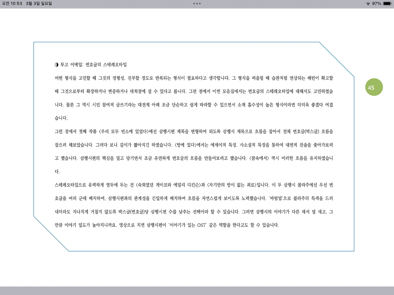 어떤 형식을 고민할 때 그것의 정형성, 진부할 정도로 반복되는 형식이 필요하다고 생각합니다. 그 형식을 떠올릴 때 습관처럼 연상되는 패턴이 확고할 때 그것으로부터 확장하거나 변증하거나 대척점에 설 수 있다고 봅니다. 그런 점에서 이번 모음집에서는 번호글의 스테레오타입에 대해서도 고민하였습니다. 물론 그 역시 시민 참여적 글쓰기라는 대전제 아래 조금 단순하고 쉽게 따라할 수 있으면서 소재 흡수성이 높은 형식이라면 더더욱 좋겠다 여겼습니다.
