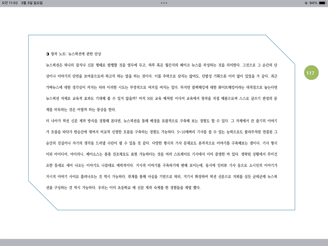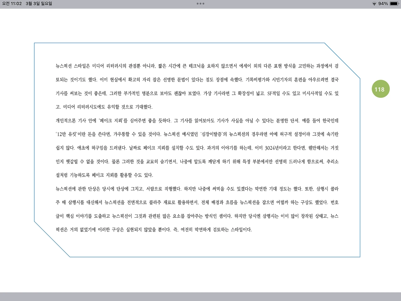 뉴스픽션 스타일은 미디어 리터러시의 관점뿐 아니라, 짧은 시간에 큰 테크닉을 요하지 않으면서 에세이 외의 다른 표현 방식을 고민하는 과정에서 검토되는 것이기도 했다. 이미 현실에서 확고히 자리 잡은 선명한 문법이 있다는 점도 장점에 속했다. 기록비평가와 시민기자의 훈련을 아우르려면 결국 기사를 써보는 것이 좋은데, 그러한 부가적인 명분으로 보아도 괜찮아 보였다. 가상 기사라면 그 확장성이 넓고. SF적일 수도 있고 미시사적일 수도 있고. 미디어 리터러시도에도 유익할 것으로 기대했다.