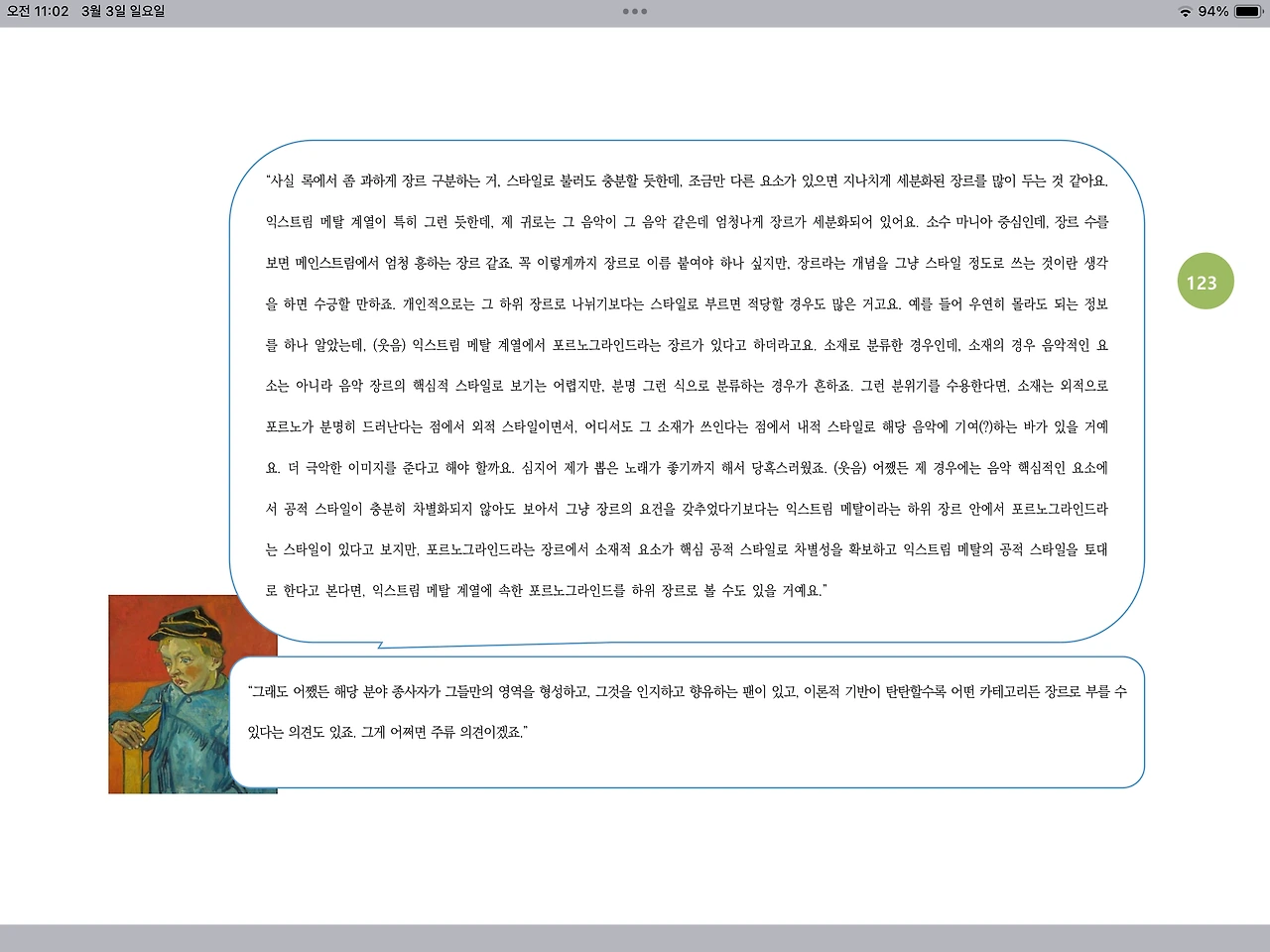 “사실 록에서 좀 과하게 장르 구분하는 거, 스타일로 불러도 충분할 듯한데, 조금만 다른 요소가 있으면 지나치게 세분화된 장르를 많이 두는 것 같아요. 익스트림 메탈 계열이 특히 그런 듯한데, 제 귀로는 그 음악이 그 음악 같은데 엄청나게 장르가 세분화되어 있어요. 소수 마니아 중심인데, 장르 수를 보면 메인스트림에서 엄청 흥하는 장르 같죠. 꼭 이렇게까지 장르로 이름 붙여야 하나 싶지만, 장르라는 개념을 그냥 스타일 정도로 쓰는 것이란 생각을 하면 수긍할 만하죠. 개인적으로는 그 하위 장르로 나뉘기보다는 스타일로 부르면 적당할 경우도 많은 거고요. 예를 들어 우연히 몰라도 되는 정보를 하나 알았는데, (웃음) 익스트림 메탈 계열에서 포르노그라인드라는 장르가 있다고 하더라고요. 소재로 분류한 경우인데, 소재의 경우 음악적인 요소는 아니라 음악 장르의 핵심적 스타일로 보기는 어렵지만, 분명 그런 식으로 분류하는 경우가 흔하죠. 그런 분위기를 수용한다면, 소재는 외적으로 포르노가 분명히 드러난다는 점에서 외적 스타일이면서, 어디서도 그 소재가 쓰인다는 점에서 내적 스타일로 해당 음악에 기여(?)하는 바가 있을 거예요. 더 극악한 이미지를 준다고 해야 할까요. 심지어 제가 뽑은 노래가 좋기까지 해서 당혹스러웠죠. (웃음) 어쨌든 제 경우에는 음악 핵심적인 요소에서 공적 스타일이 충분히 차별화되지 않아도 보아서 그냥 장르의 요건을 갖추었다기보다는 익스트림 메탈이라는 하위 장르 안에서 포르노그라인드라는 스타일이 있다고 보지만, 포르노그라인드라는 장르에서 소재적 요소가 핵심 공적 스타일로 차별성을 확보하고 익스트림 메탈의 공적 스타일을 토대로 한다고 본다면, 익스트림 메탈 계열에 속한 포르노그라인드를 하위 장르로 볼 수도 있을 거예요.”