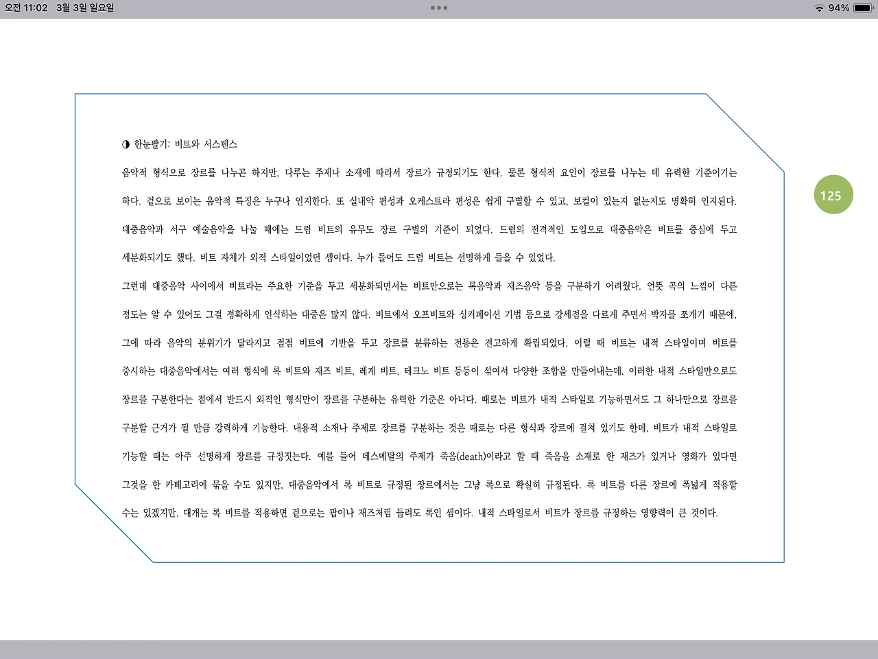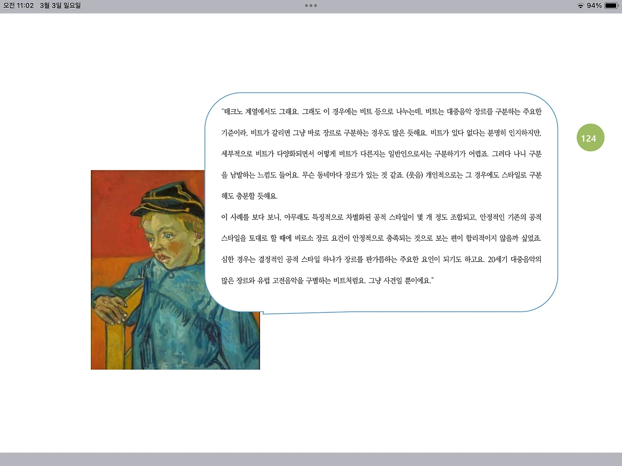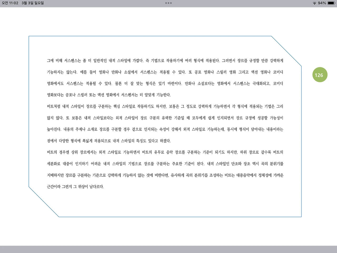 이 사례를 보다 보니, 아무래도 특징적으로 차별화된 공적 스타일이 몇 개 정도 조합되고, 안정적인 기존의 공적 스타일을 토대로 할 때에 비로소 장르 요건이 안정적으로 충족되는 것으로 보는 편이 합리적이지 않을까 싶었죠. 심한 경우는 결정적인 공적 스타일 하나가 장르를 판가름하는 주요한 요인이 되기도 하고요. 20세기 대중음악의 많은 장르와 유럽 고전음악을 구별하는 비트처럼요. 그냥 사견일 뿐이에요.”