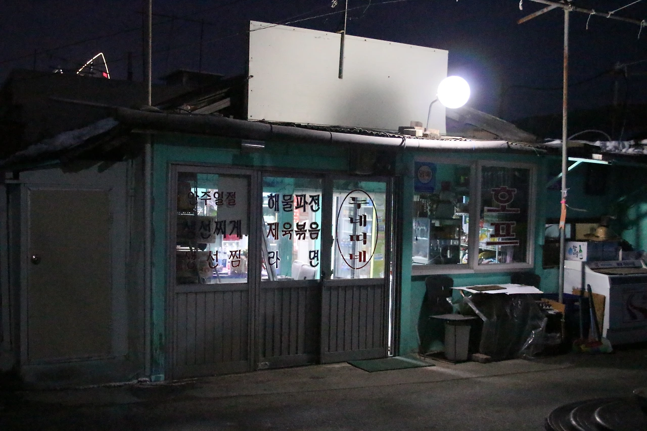 조금 더 들어가자 얼마나 오래됐을지 감도 잡히지 않는 작은 가게가 눈에 들어왔다. 해물파전, 라면 등 여러 음식을 파는 장소인 것 같은데 아마 시간이 지나 이제는 요리를 자주 하지 않는 듯 보였다. 어두컴컴한 거리들 한가운데 작게 피어오르는 불을 두고 그 주변에 어르신분들이 옹기종기 모여 담소를 나누고 계셨다. 어떤 얘기인지 들리지 않았지만 듣는다 해도 아마 제대로 이해하진 못했을 것 같다.