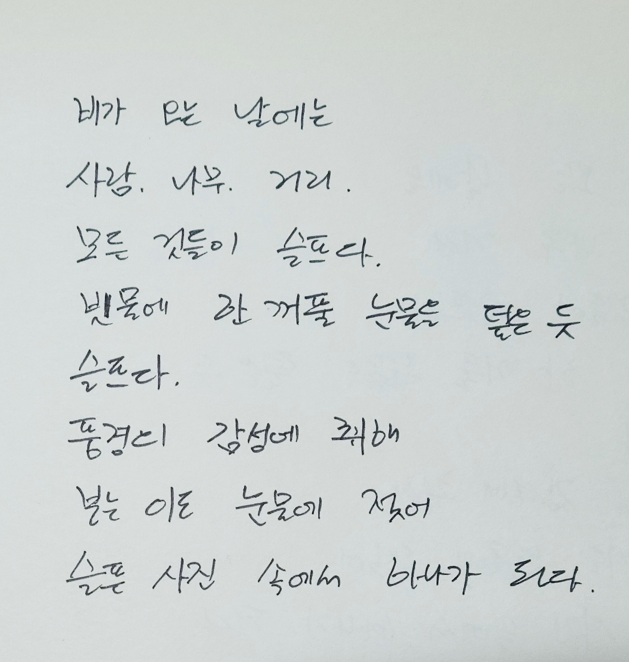 빗물에 한 꺼풀 눈물을 덮은 듯