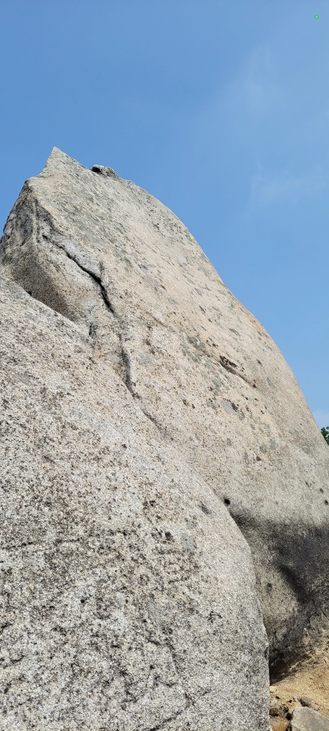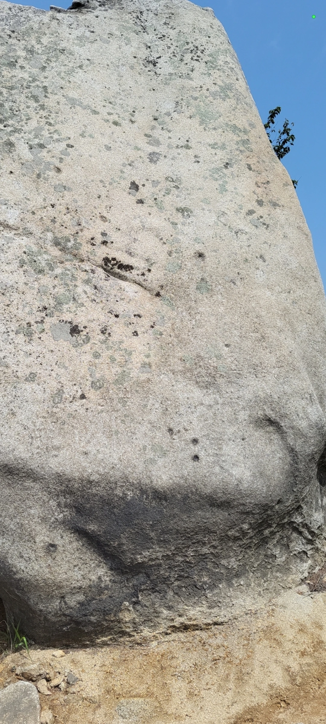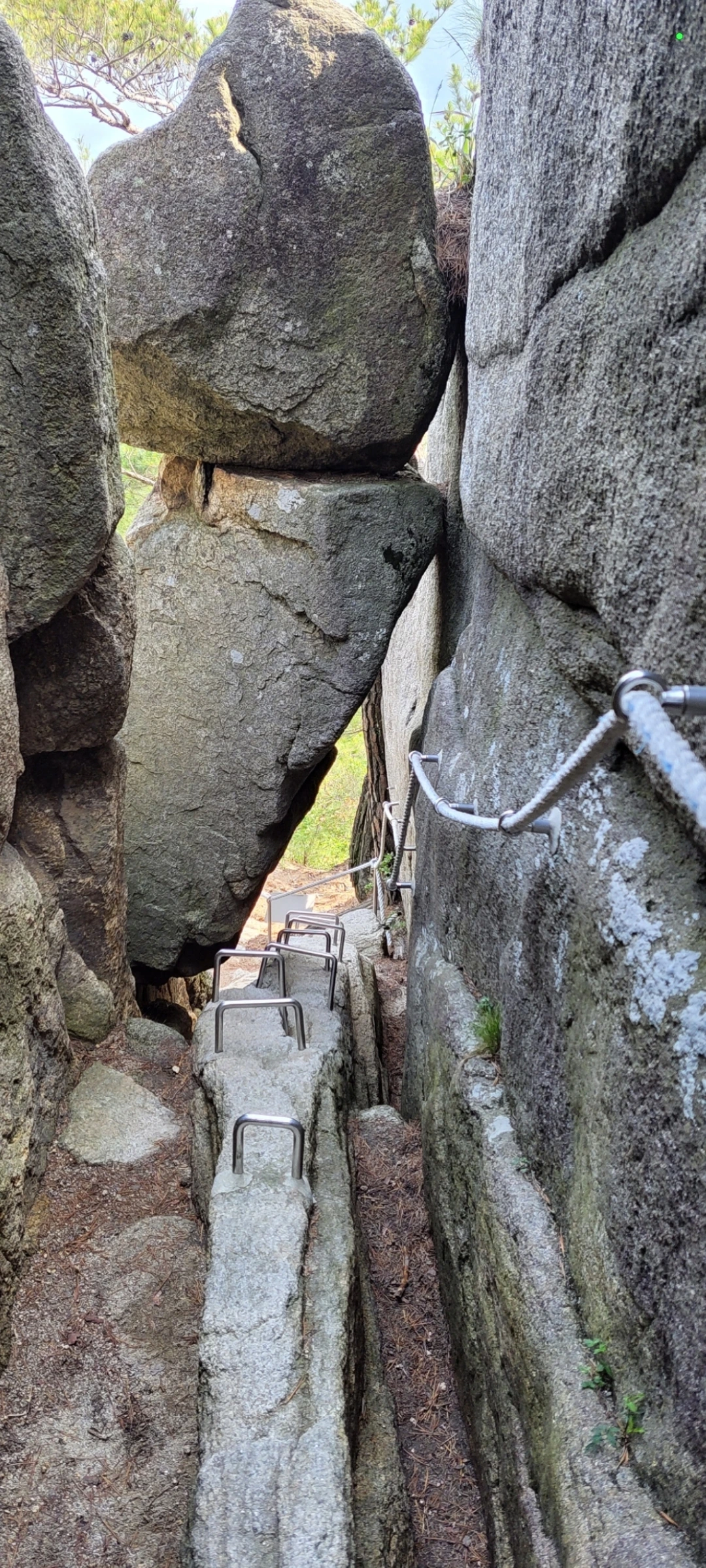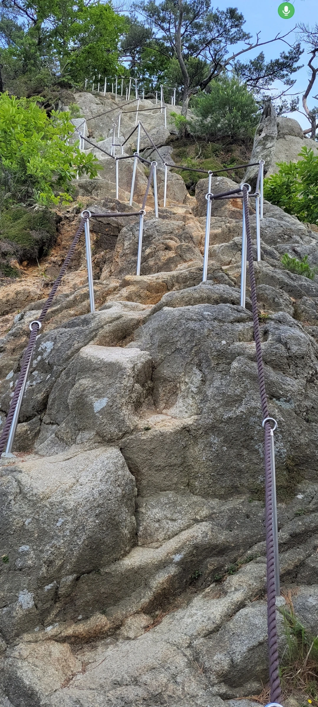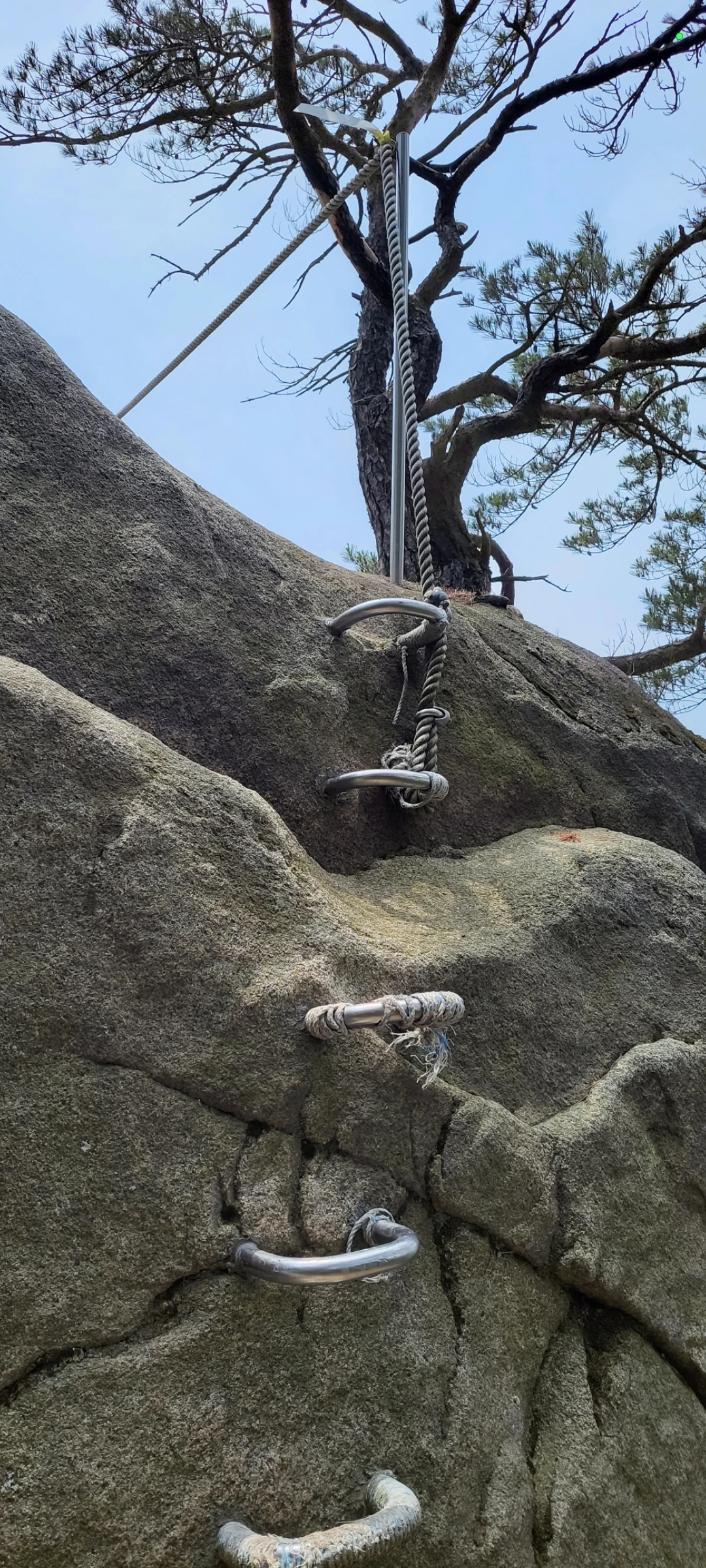 밧줄 자국으로 하단이 패인 뾰족 바위 보며