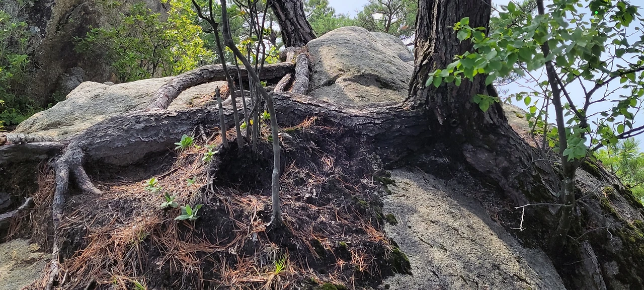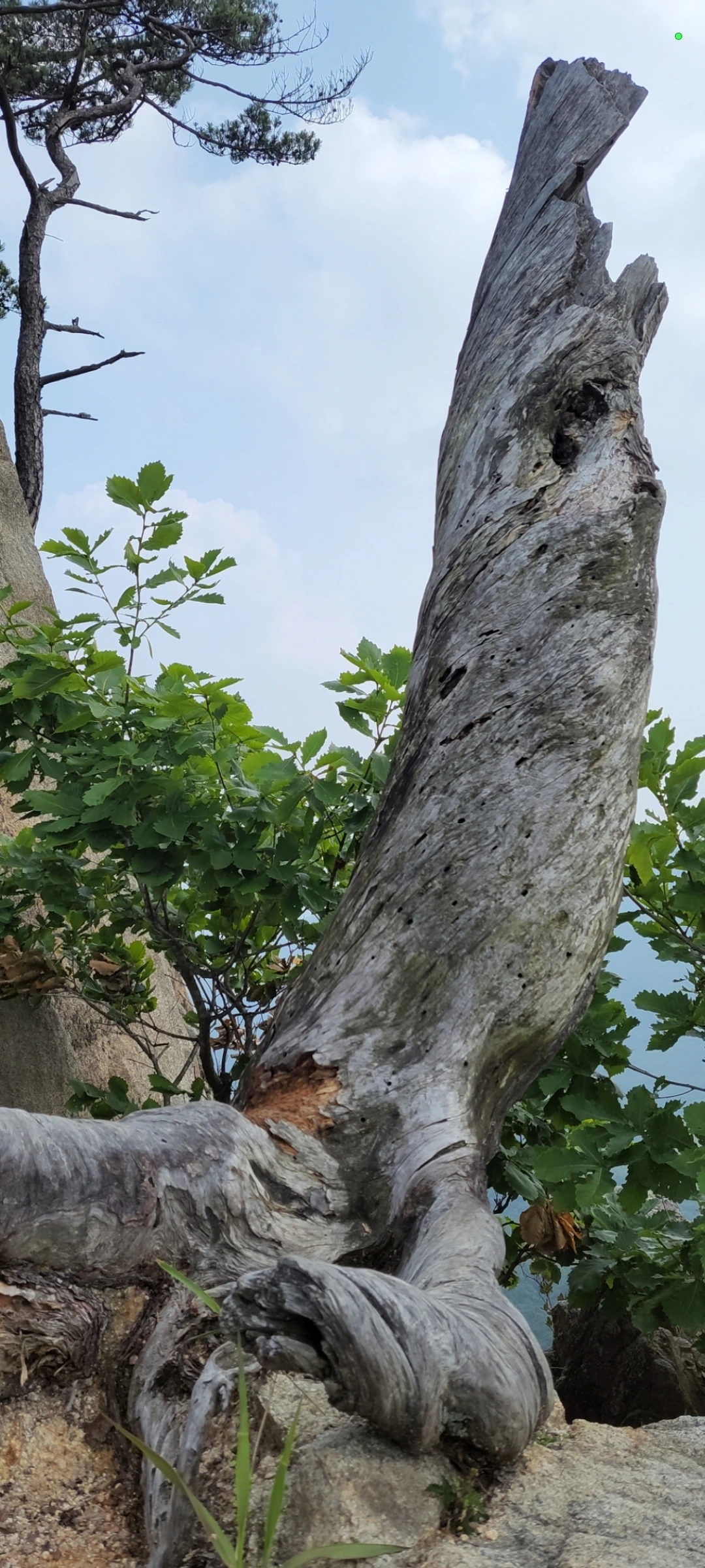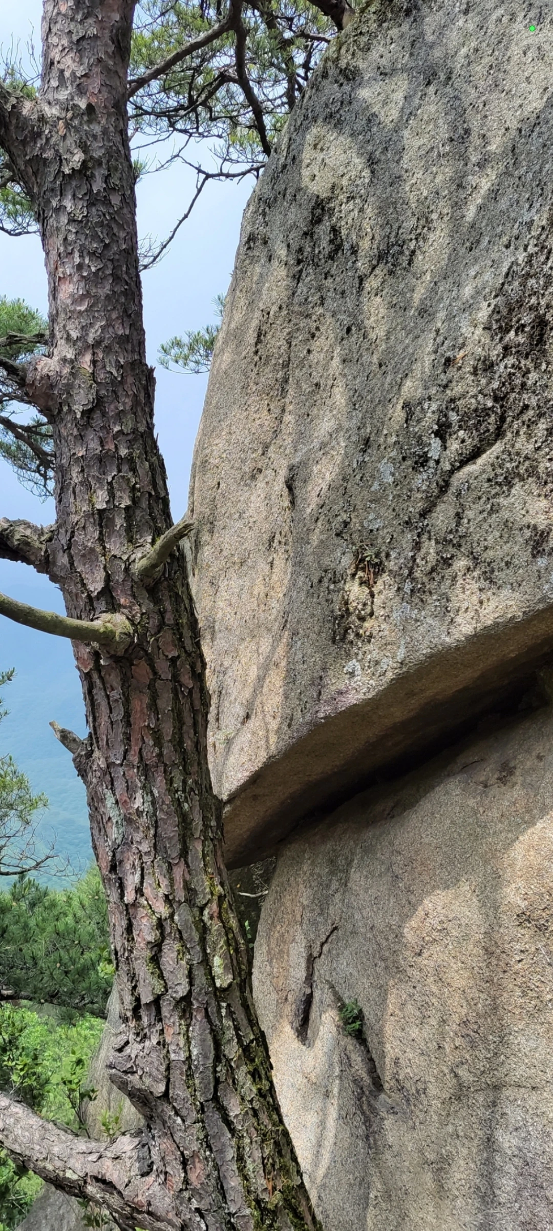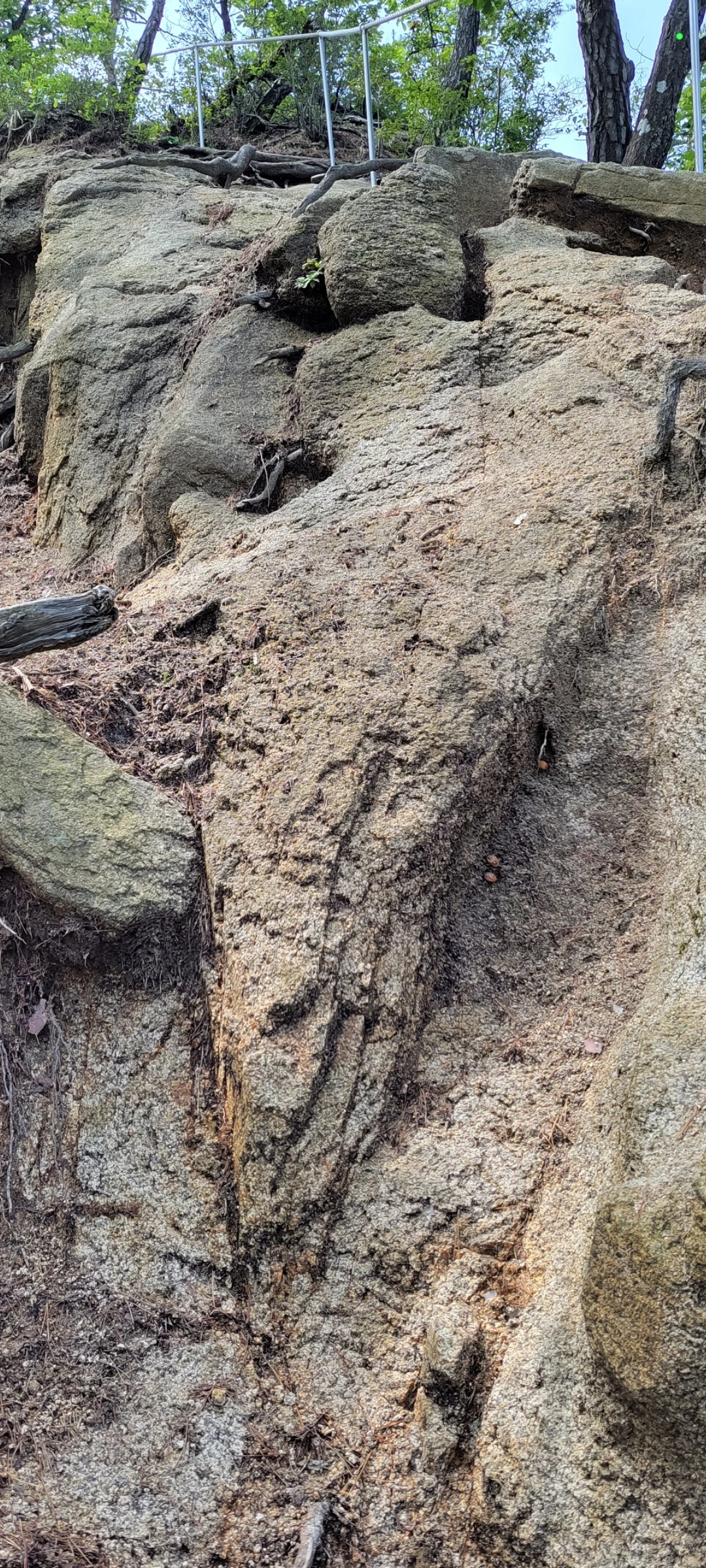 밧줄 자국으로 하단이 패인 뾰족 바위 보며