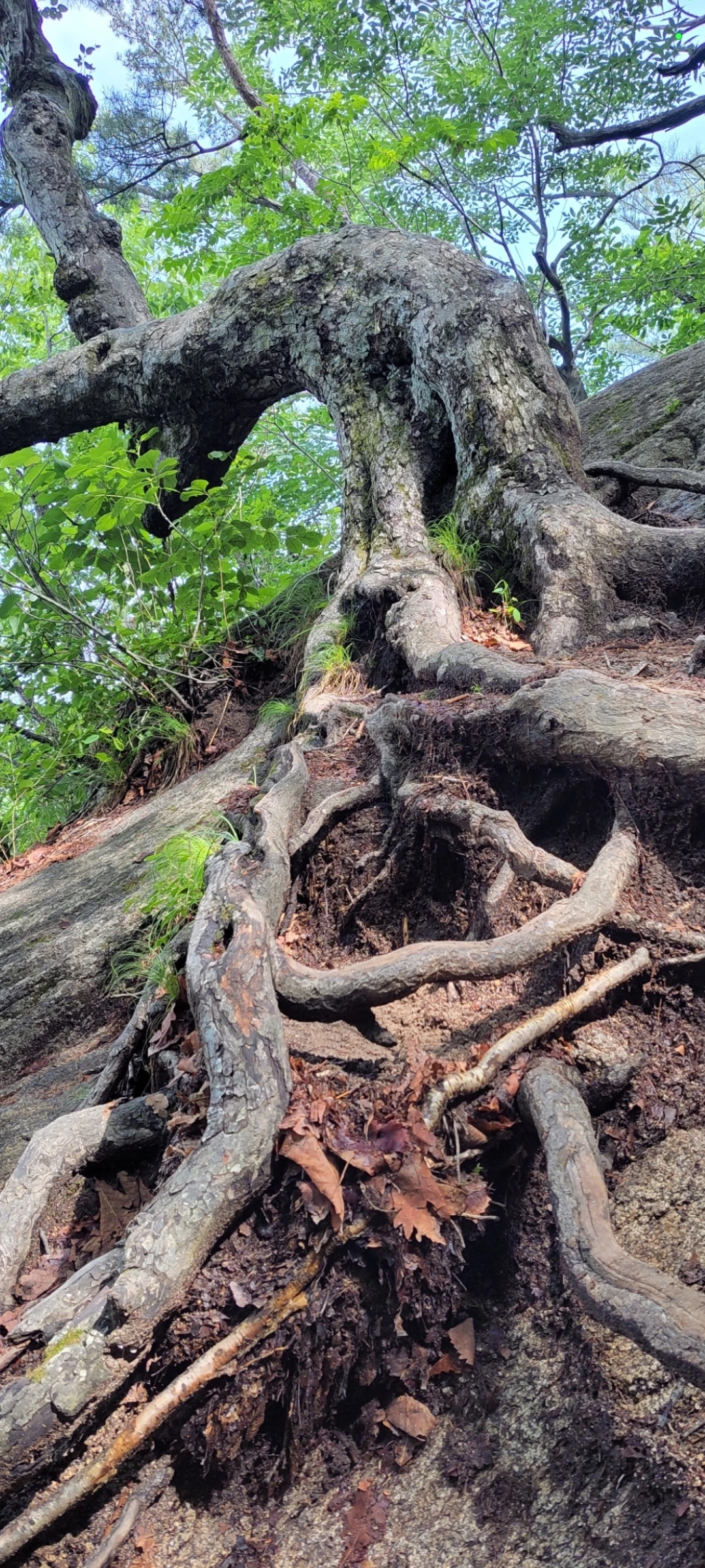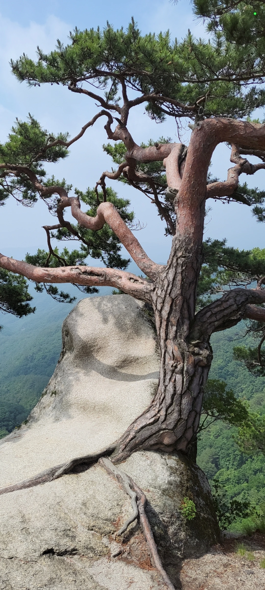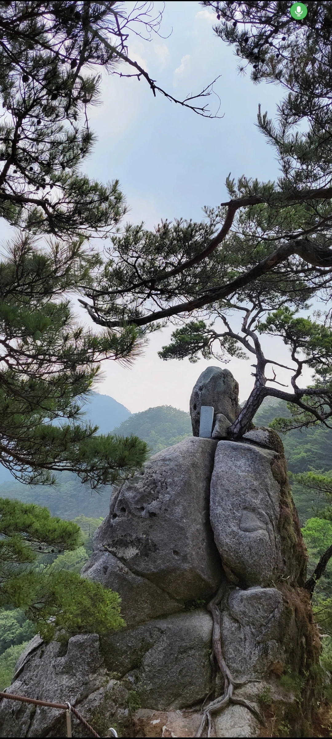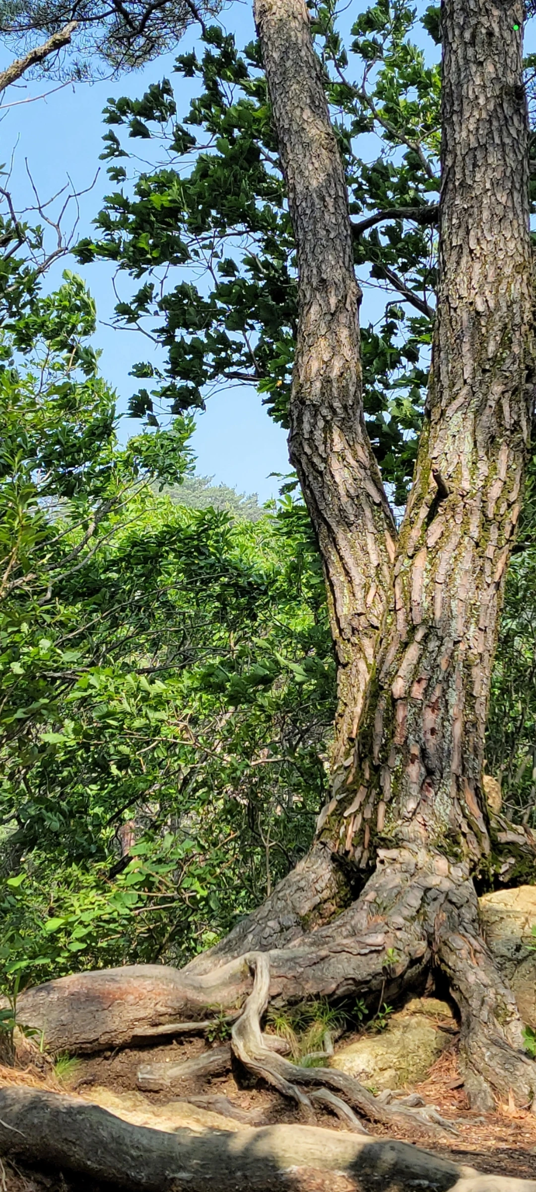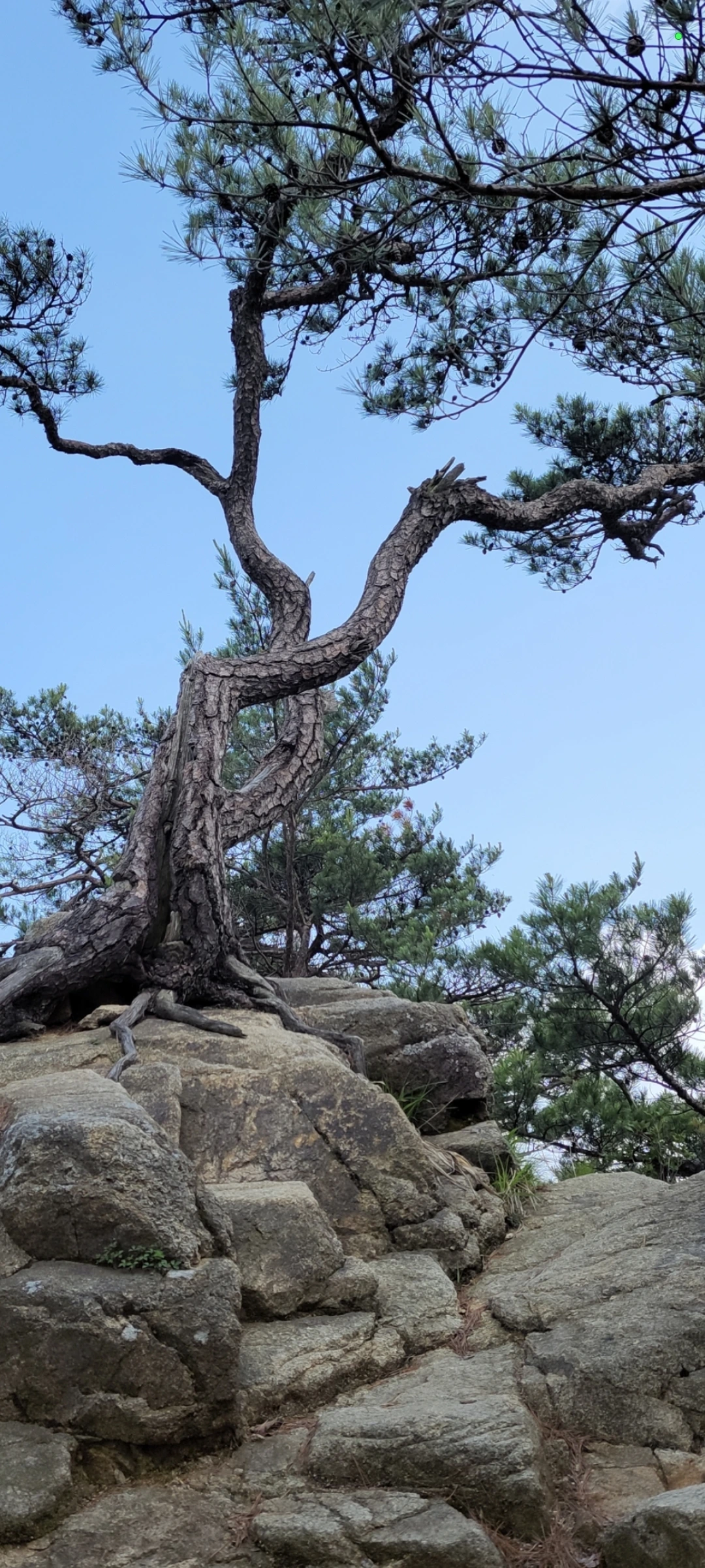 밧줄 자국으로 하단이 패인 뾰족 바위 보며