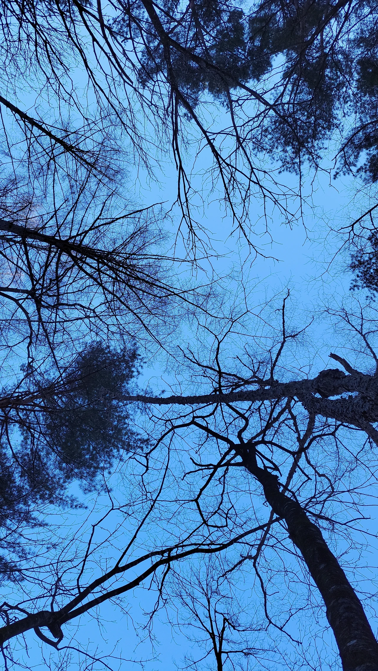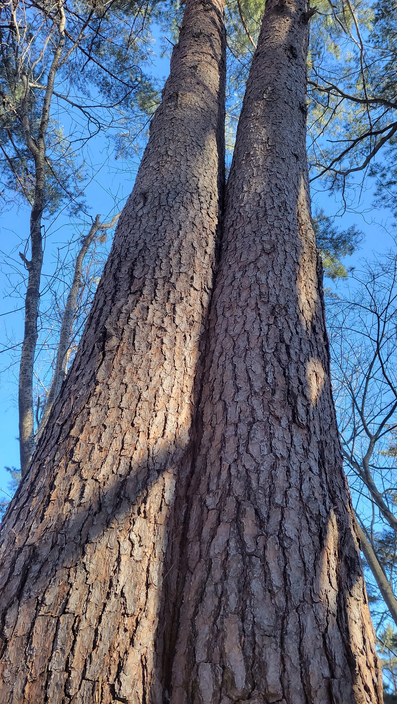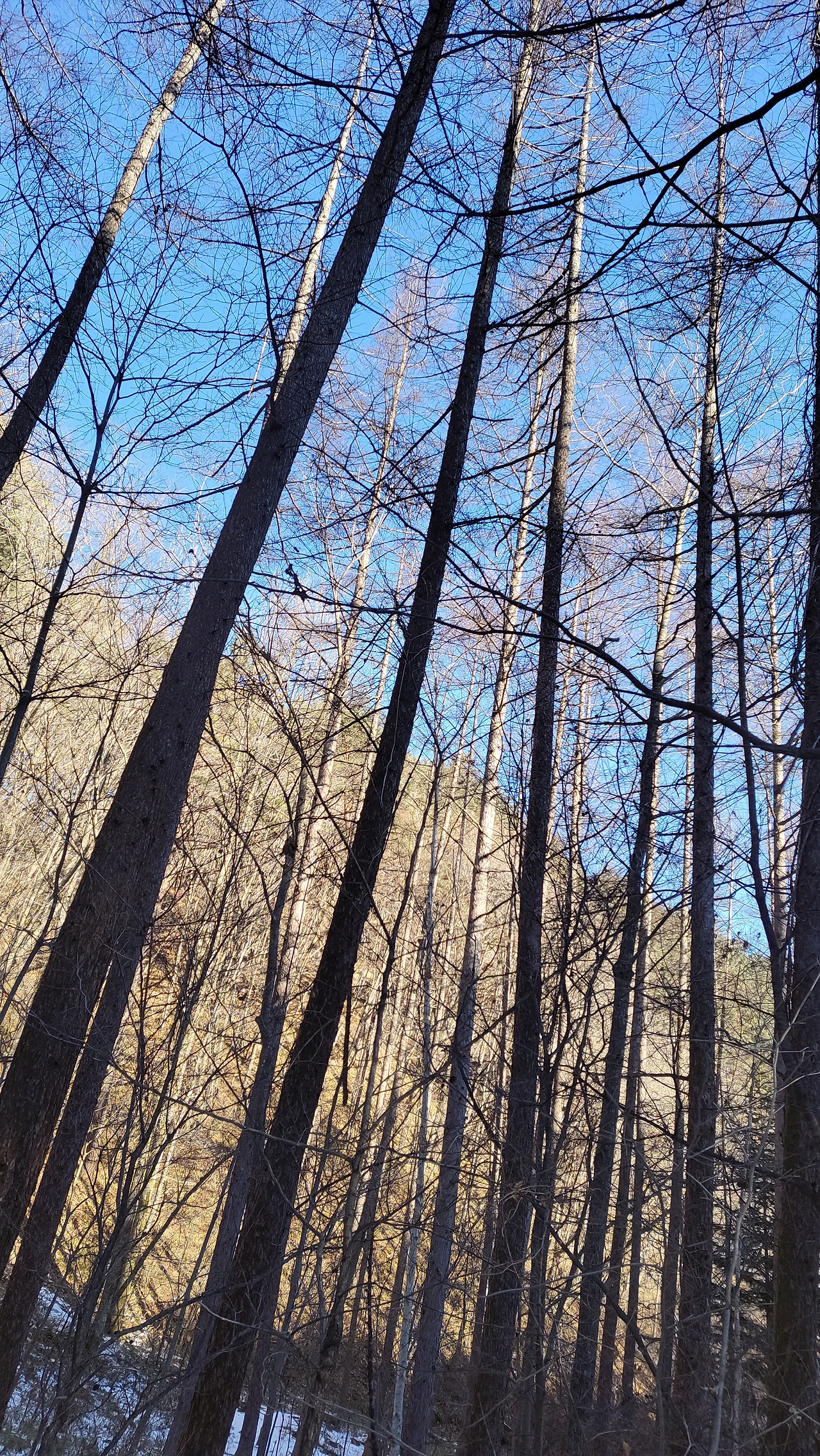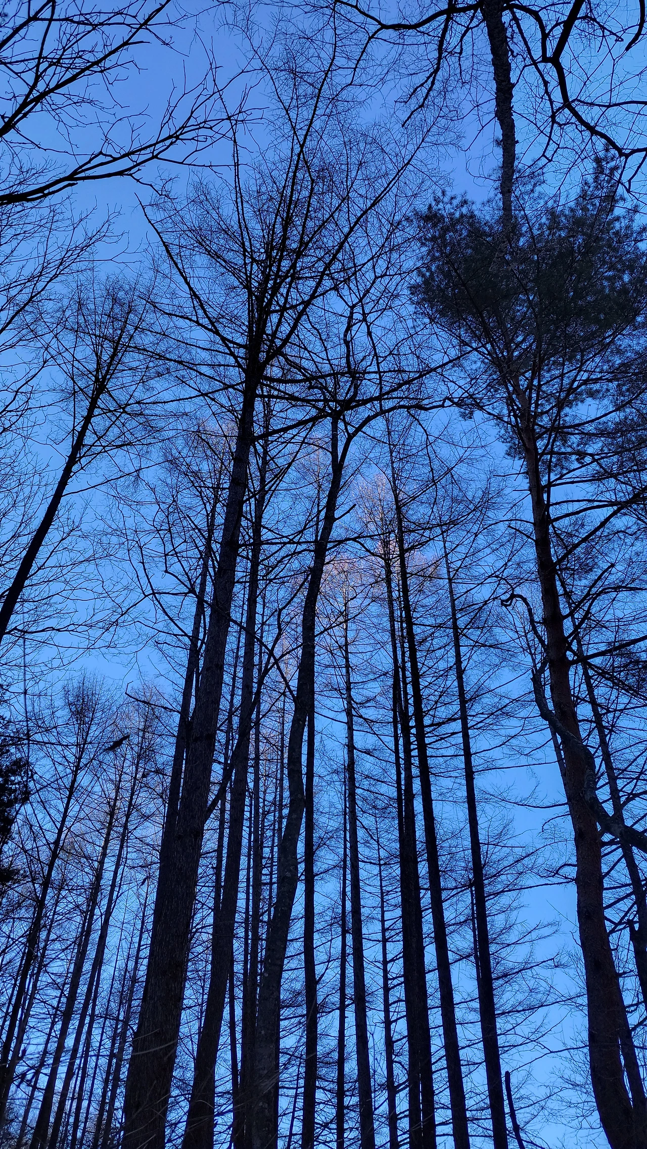 낙엽송 군락 빽빽이 하늘 가리고 있습니다.