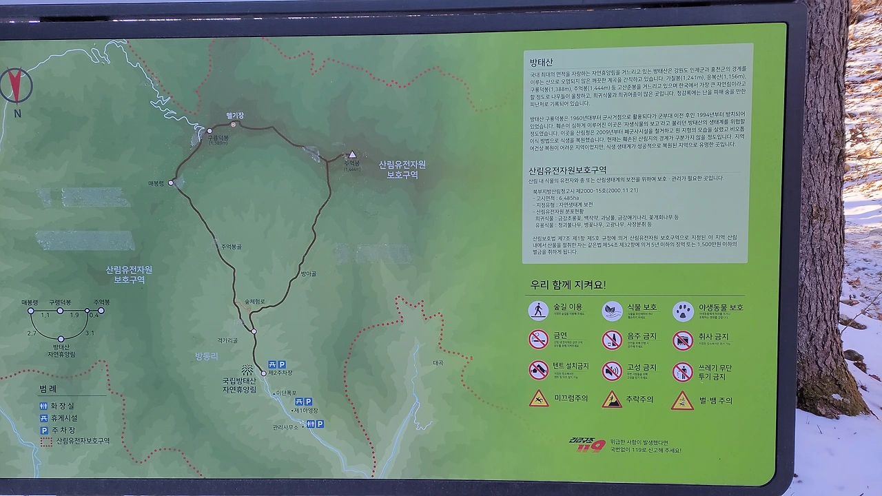 *방태산 휴양림 제1주차장~제2주차장~아랫삼거리~윗삼거리~주억봉~구룡덕봉~매봉령~아랫삼거리~원점회귀의 약 13km 7시간의 산행이었습니다.