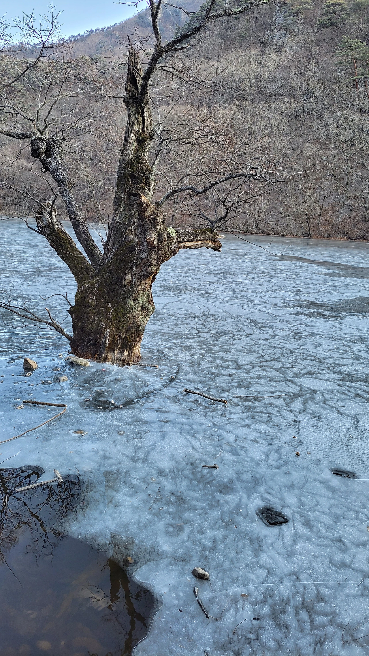 물밖으로 몸 내민 왕버들나무의 시린 아랫도리가 저수지에 얼어붙어있습니다.