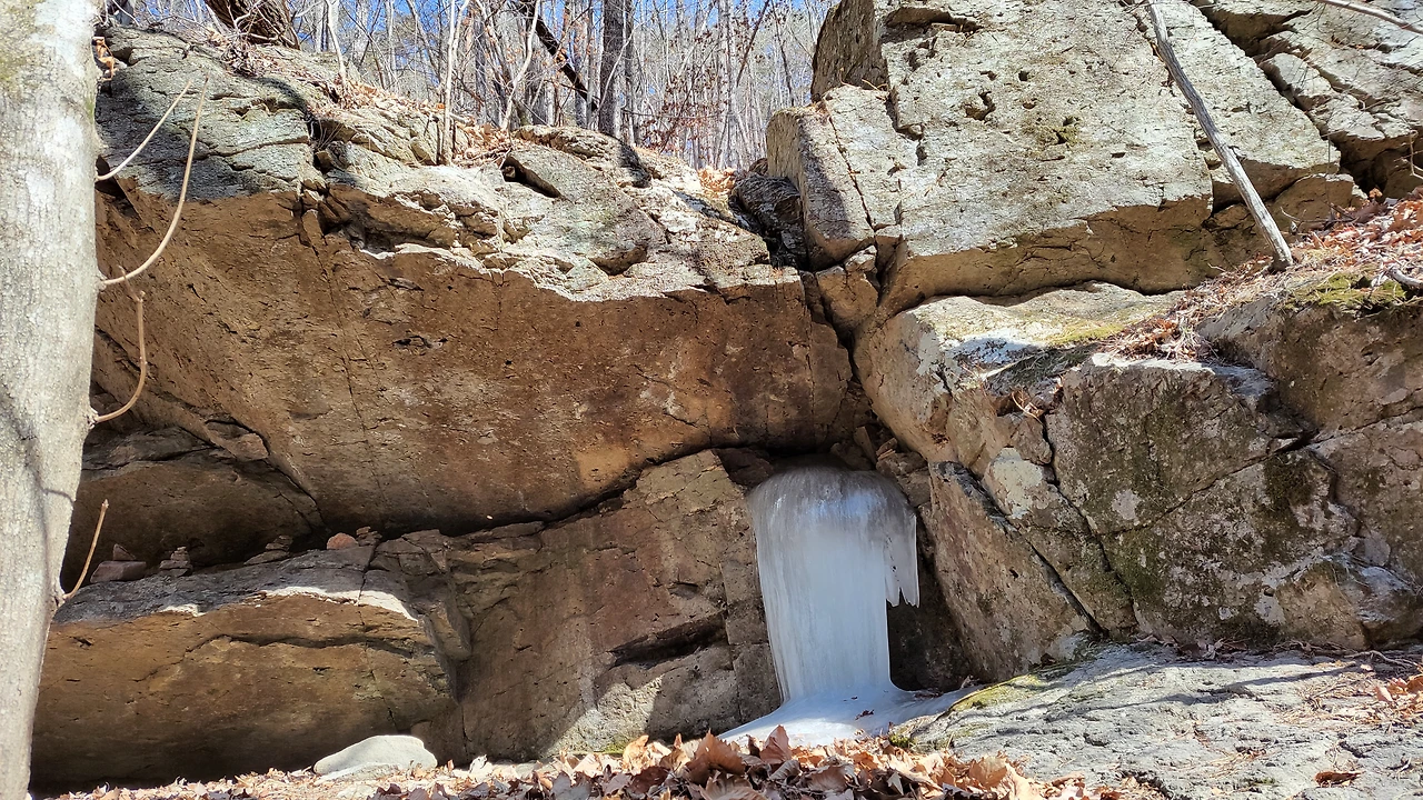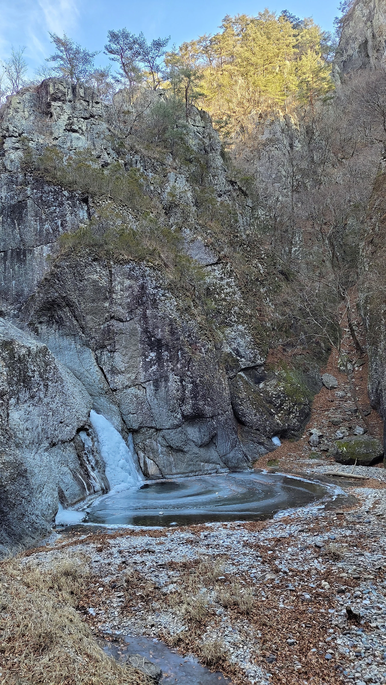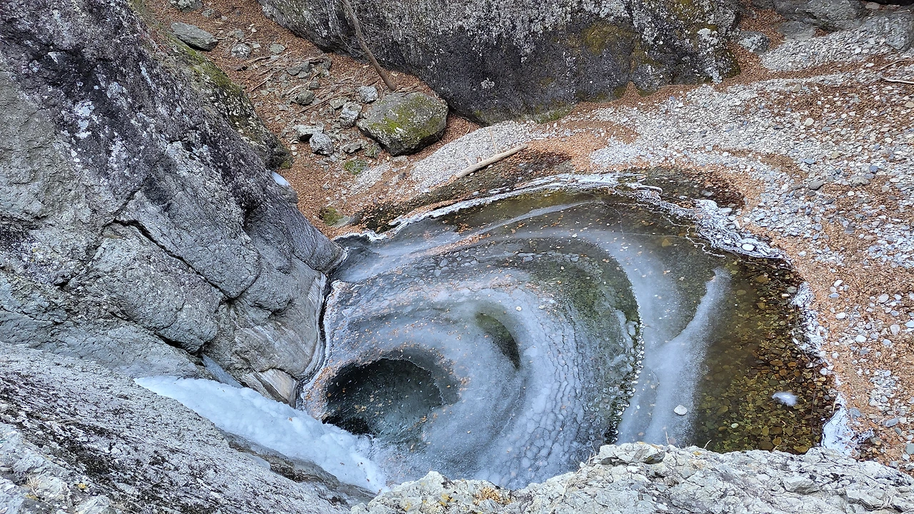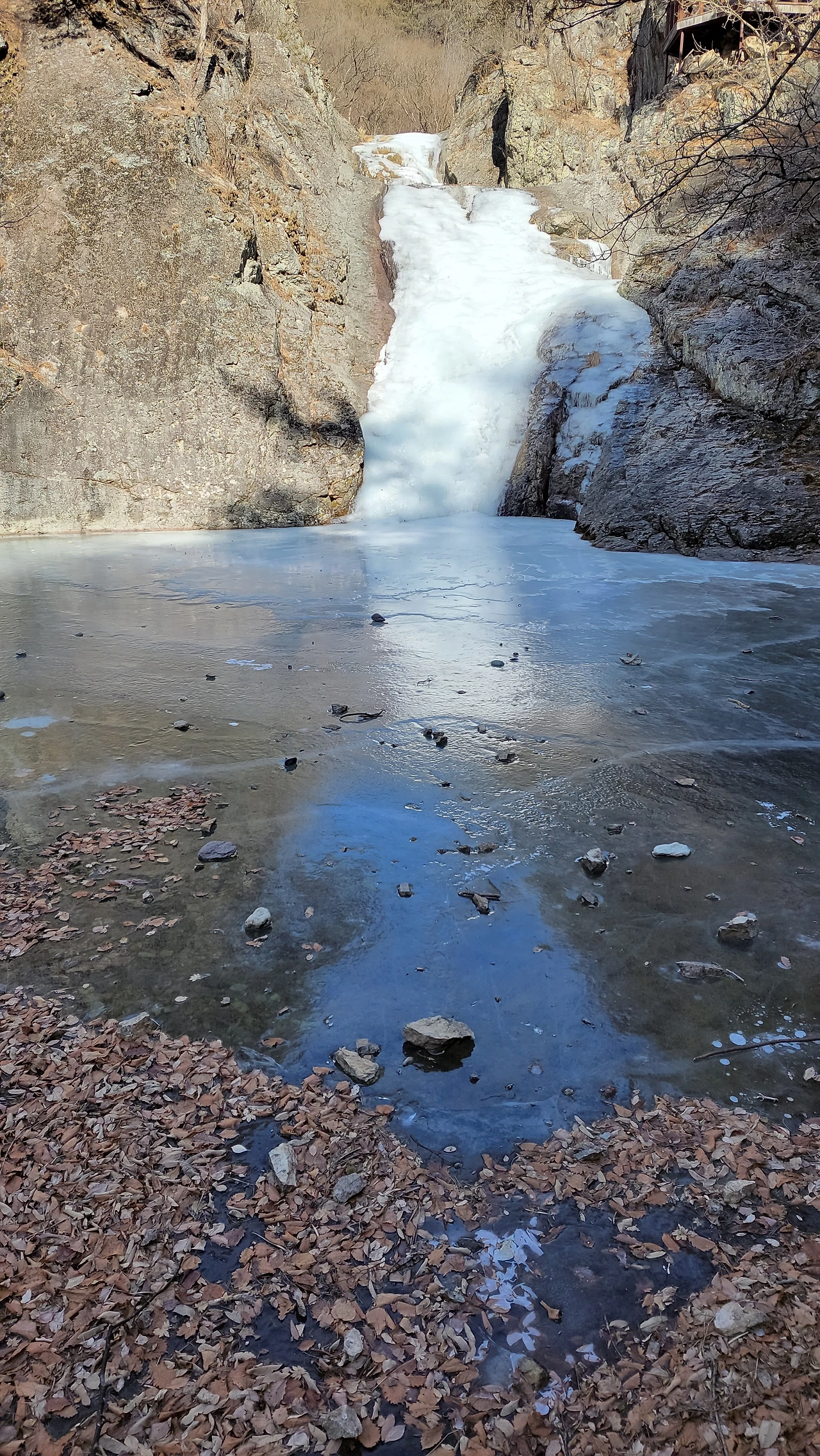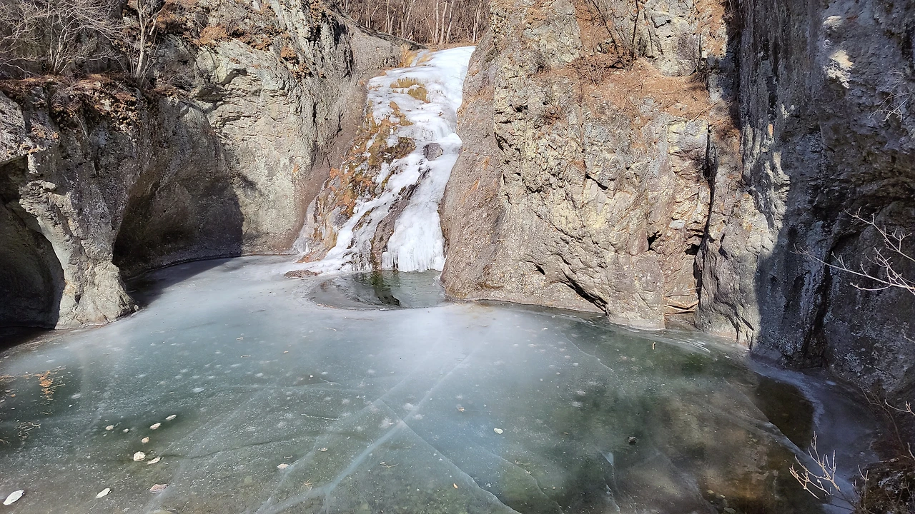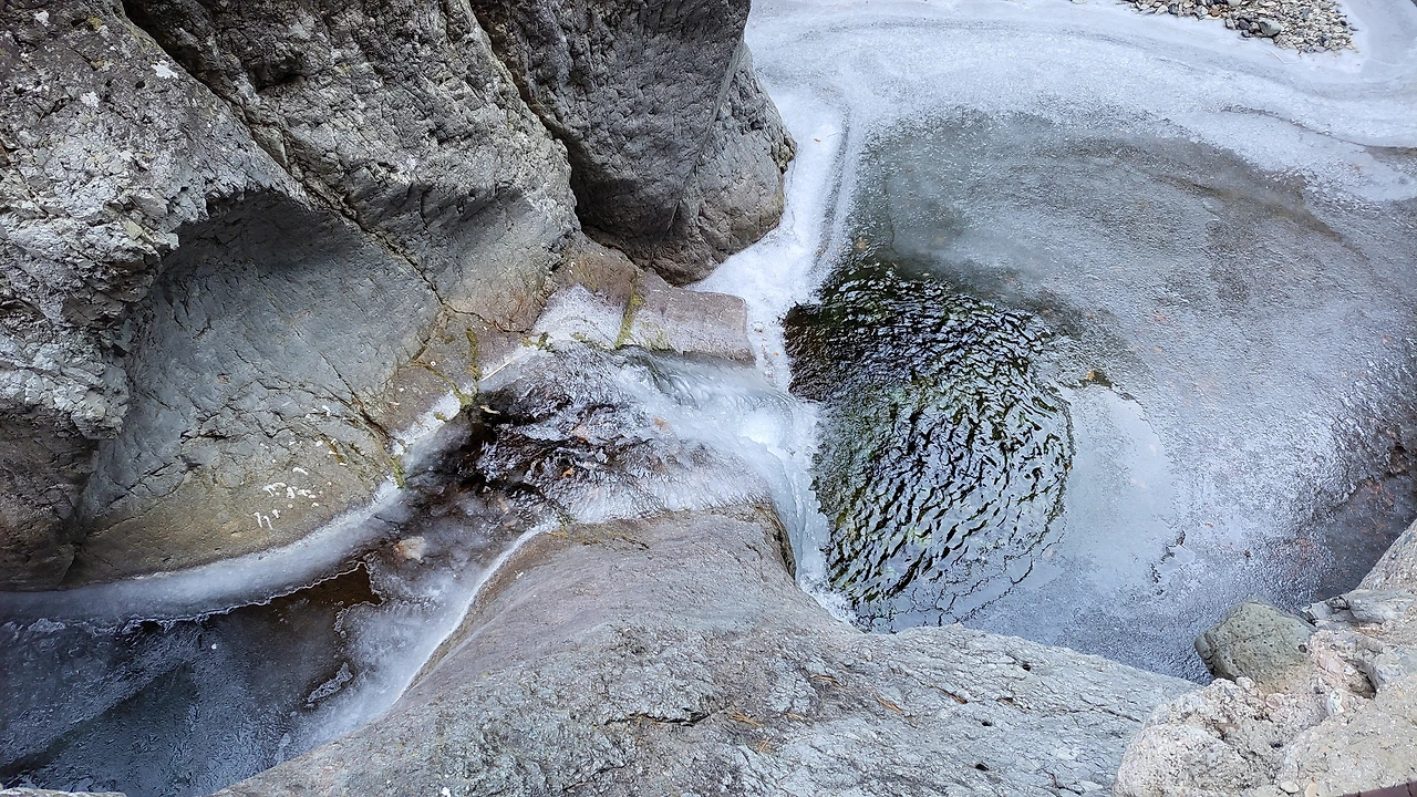 동심원 이루며 얼어져 나간 폭포수가 아름답습니다.