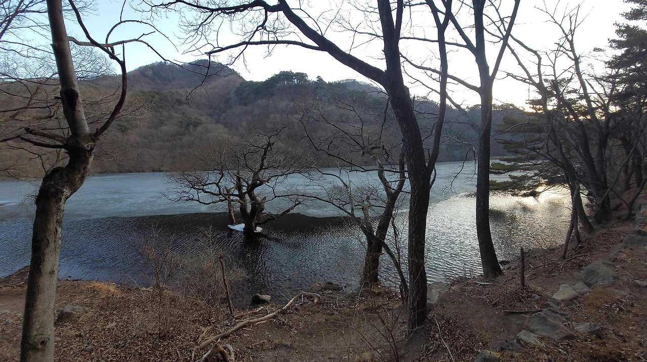 산로 따라 20여분 오르다 보면 산에 둘러싸인 그림 같은 호수 펼쳐지는데,