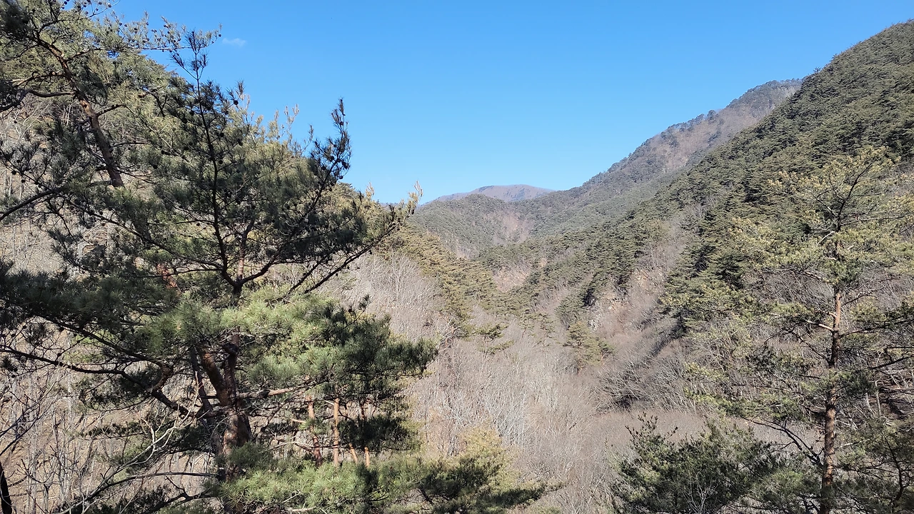 정상에서 계곡 입구 '후리메기(주왕 군사들이 훈련하던 나무)'까지는 칼날이 아니라 다행인 '칼등 고개'라는 지명의 높고 좁은 능선길 이어집니다.