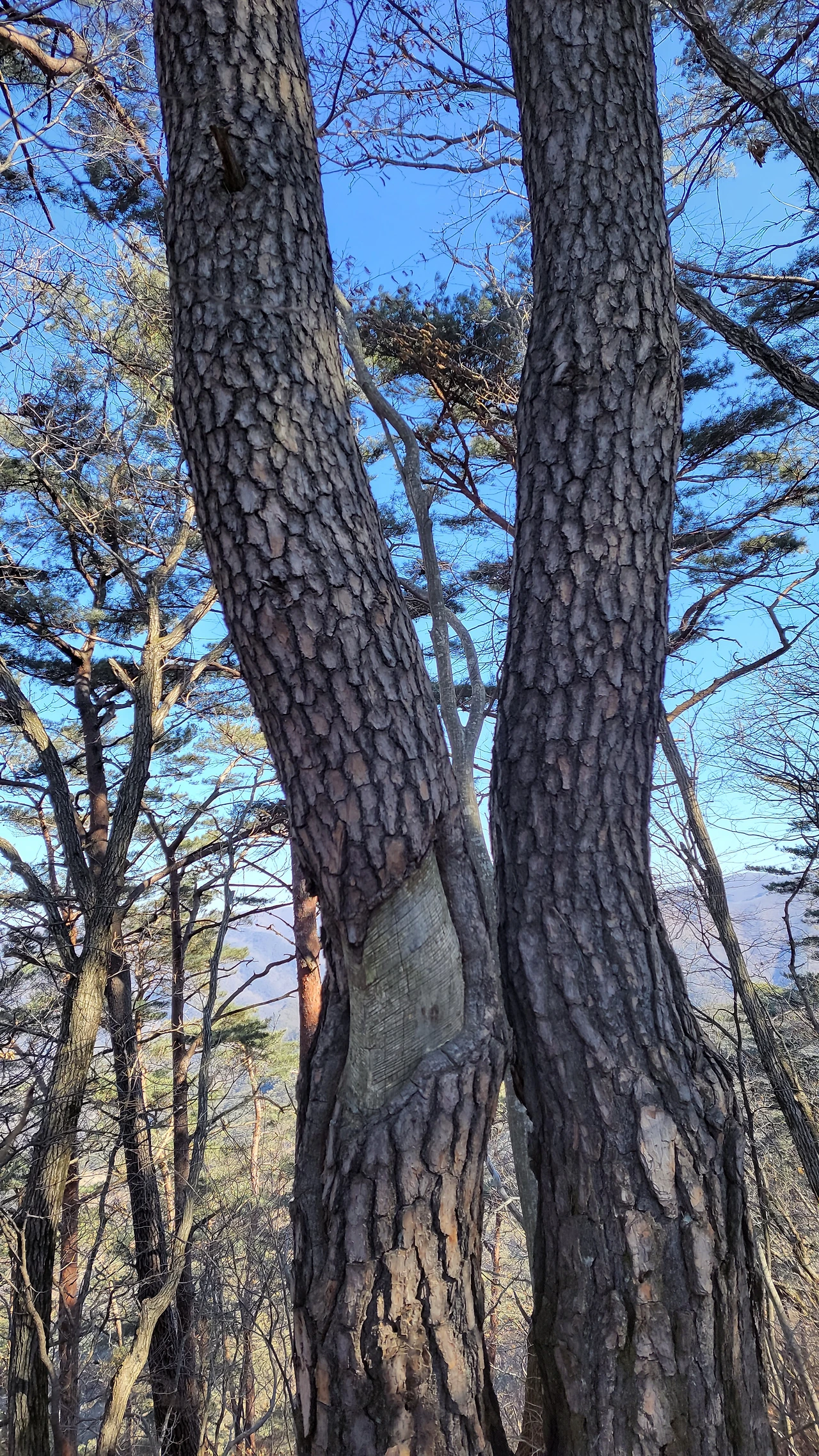 송림이 무성해 송이버섯이 많이 자란다지만, 어렵던 시절 송진 채취로 상처 남은 소나무들은 오랜 세월 지나도 아물지 않은 상흔들 아프게 드러내고 있습니다.
