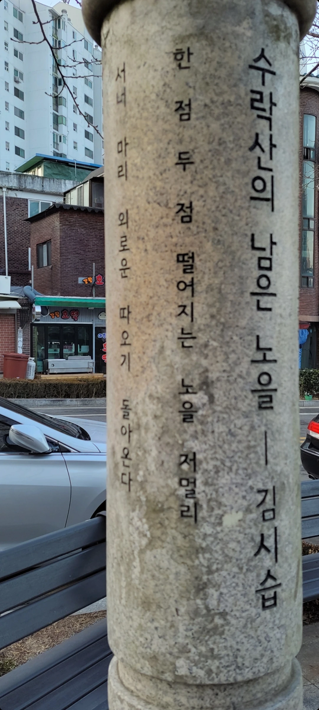 들머리 가까이 가니 매월당 김시습의 '수락산의 남은 노을(水落殘照)'이란 시가 돌기둥에 새겨져 있네요.