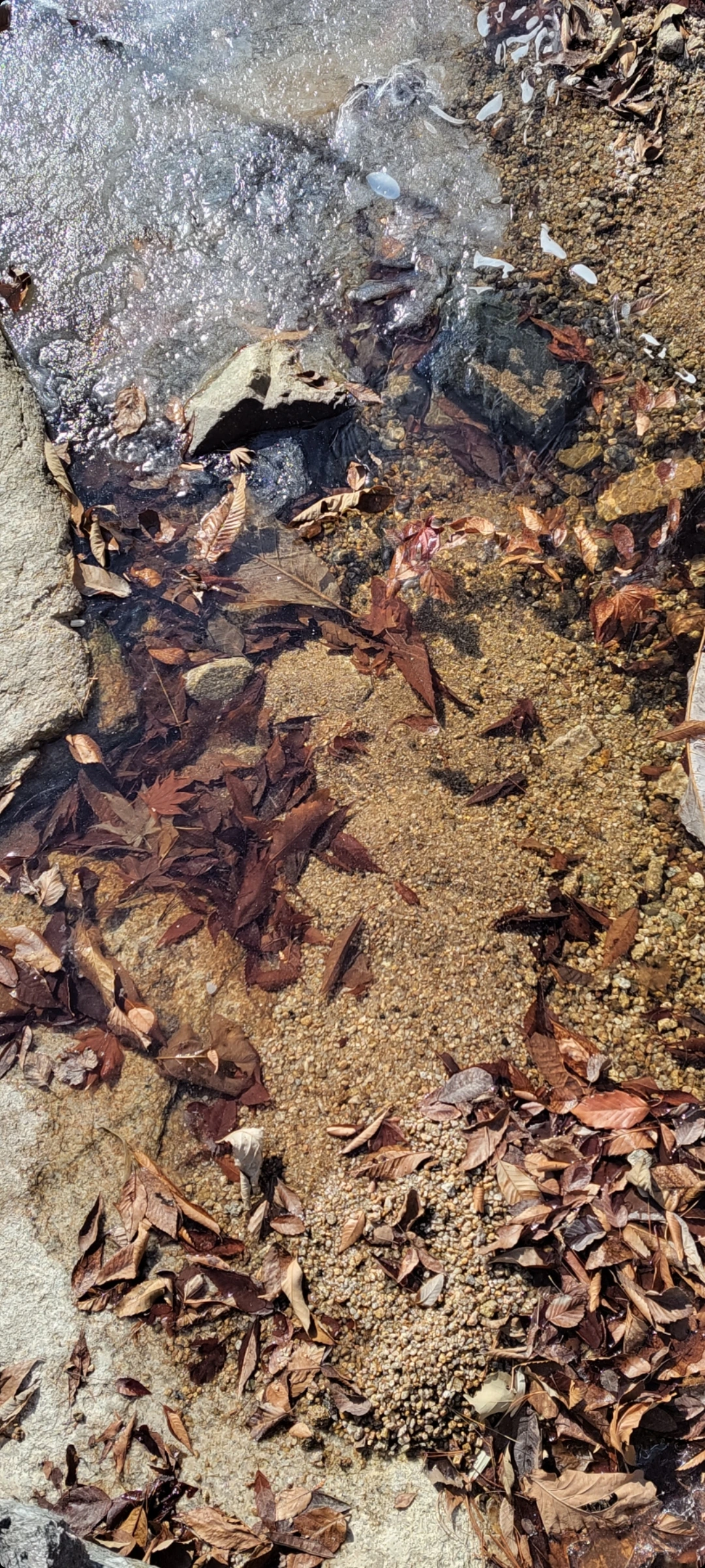겨울을 녹이고 있는 작은 개울 하나 보입니다.