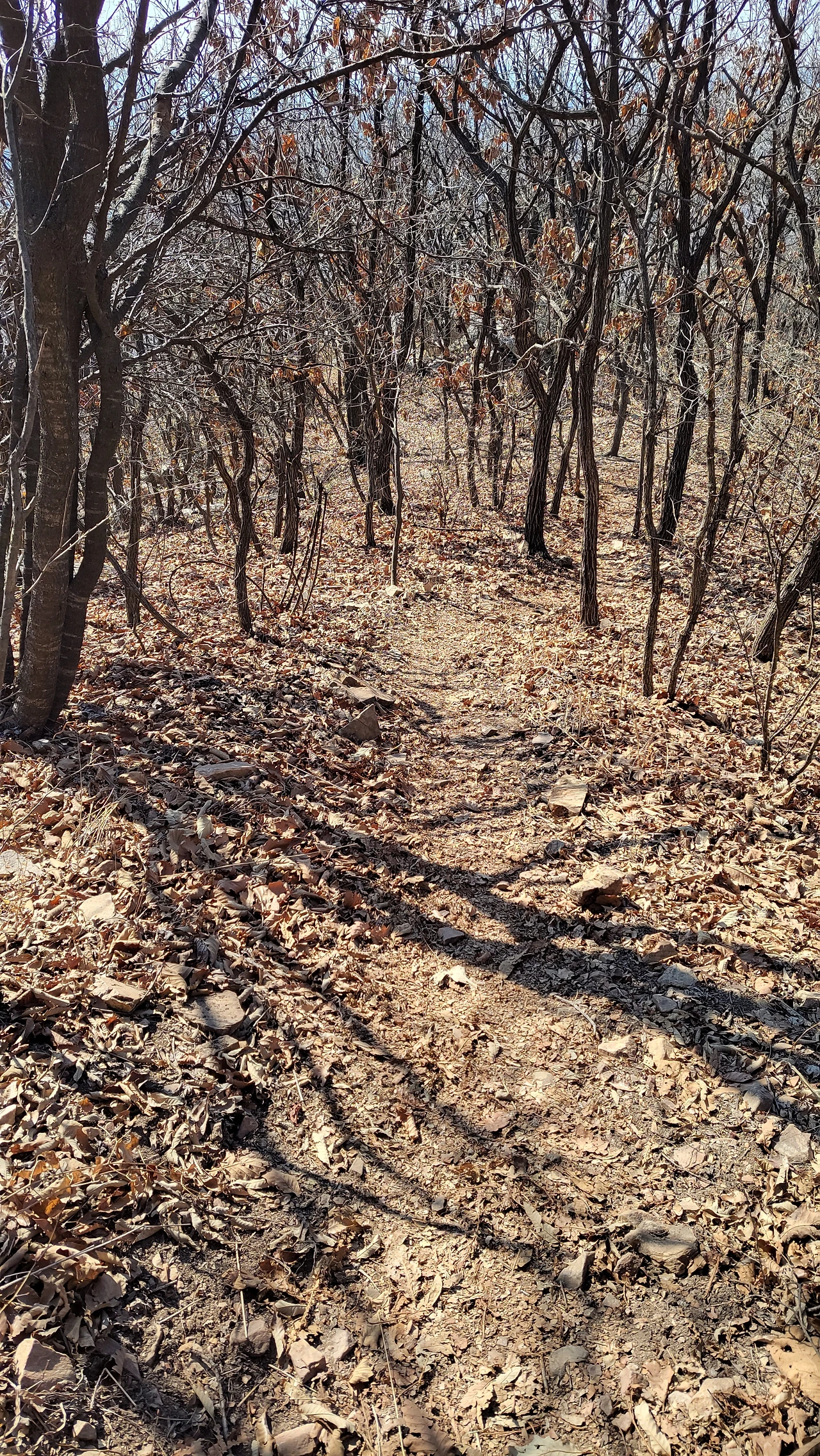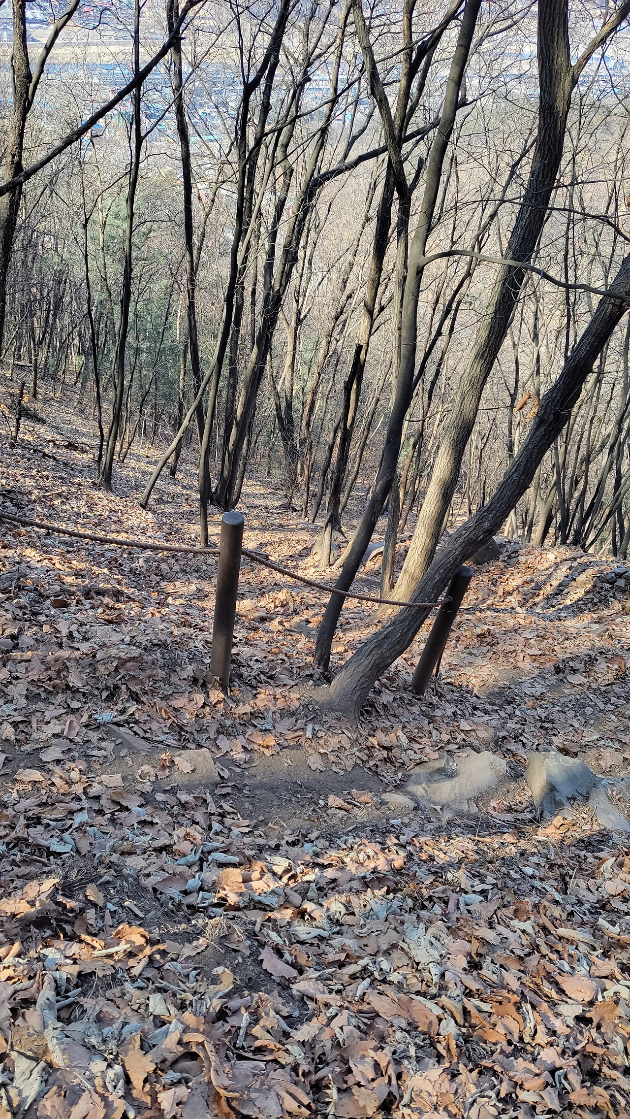 낙엽 덮인 흙길이지만 거의 수직인 길을 잔뜩 허벅지 힘주며 한참 내렸습니다.