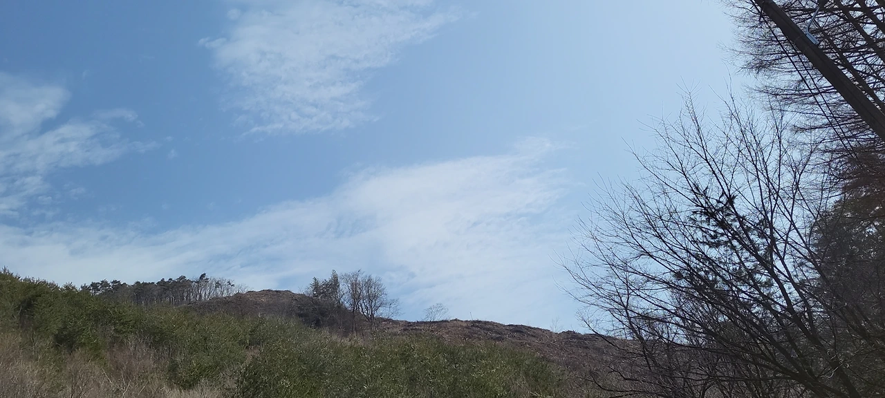 언덕에 곧게 솟은 낙엽송 사이로 맑고 푸른 하늘이 그림처럼 빛나더군요.