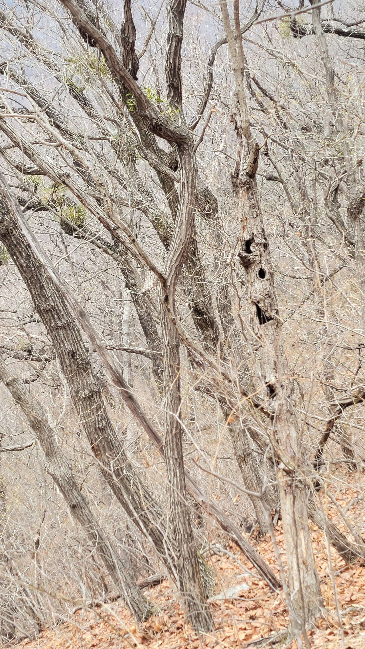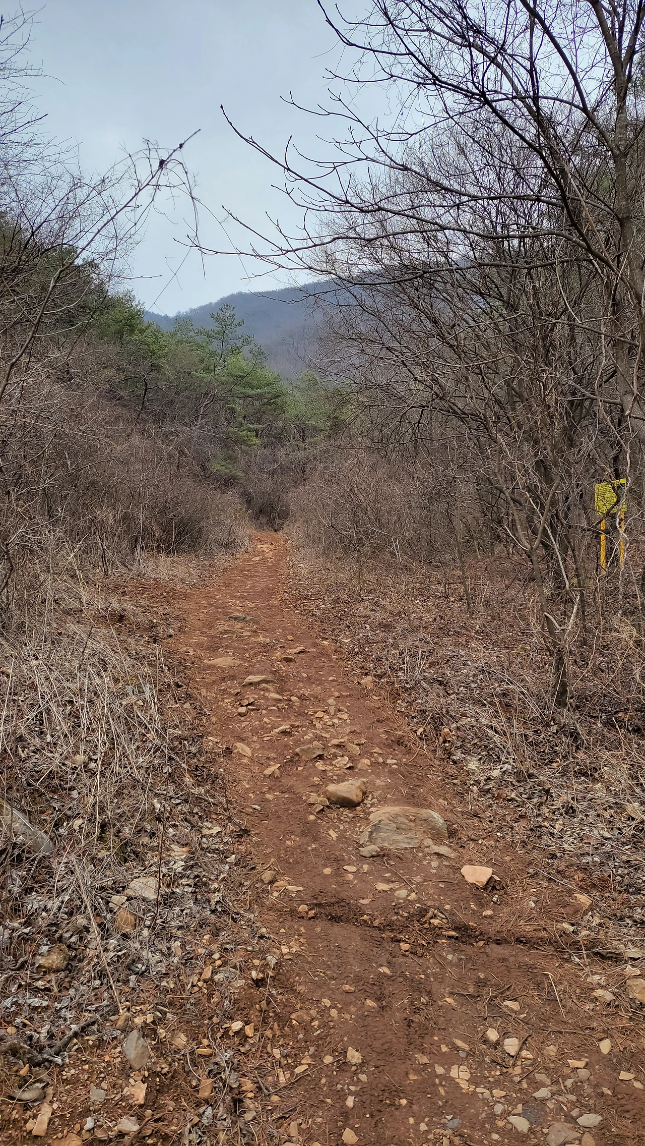 무채색 나무들이 성글어있는 겨울 숲 사이 가파른 흙길 돌길이 끝없이 이어집니다.