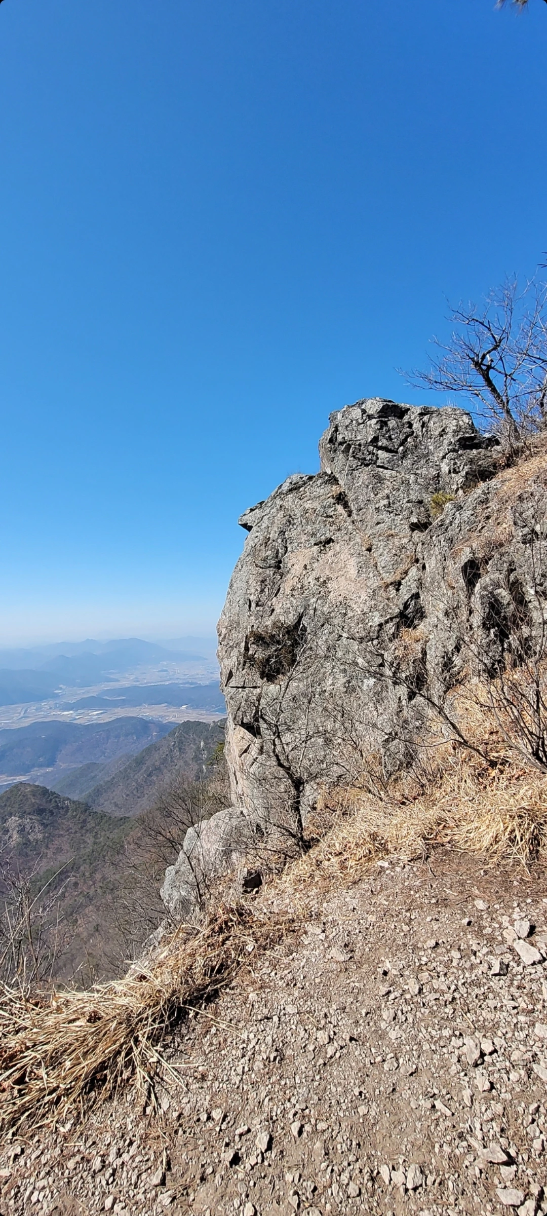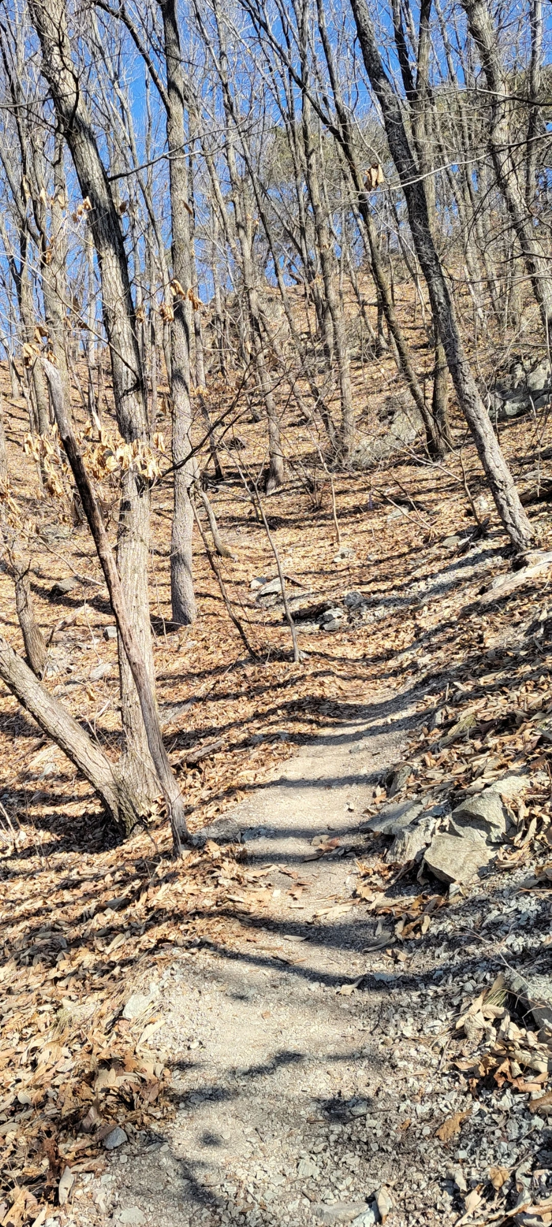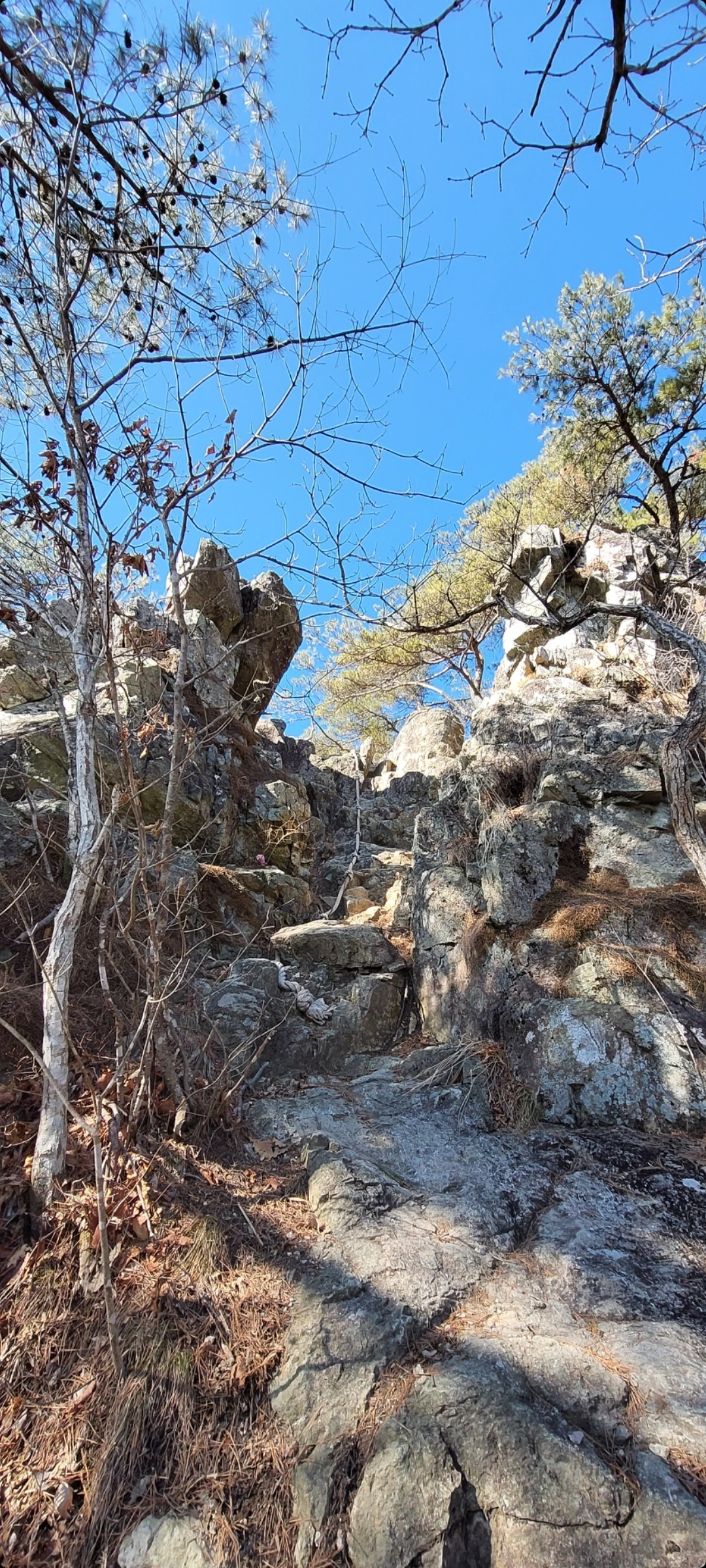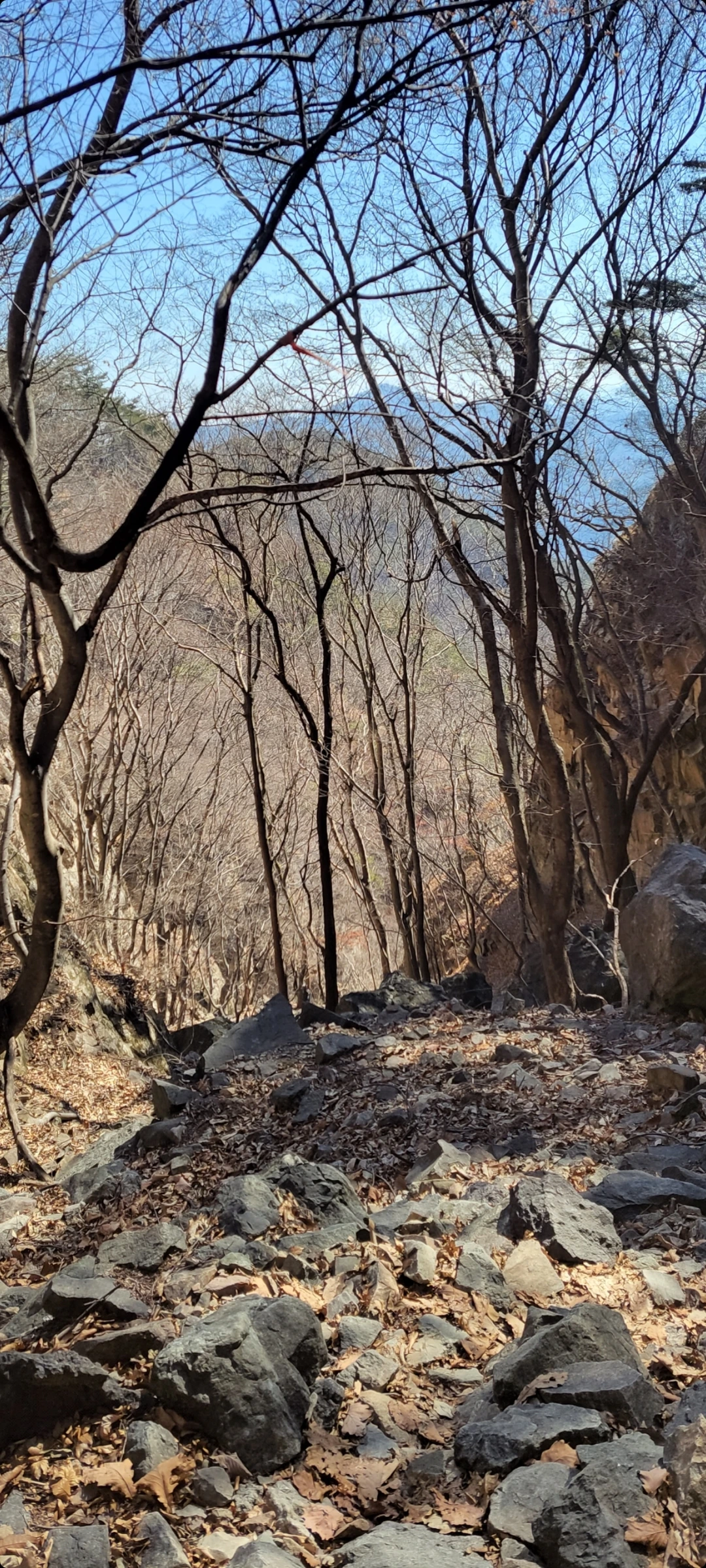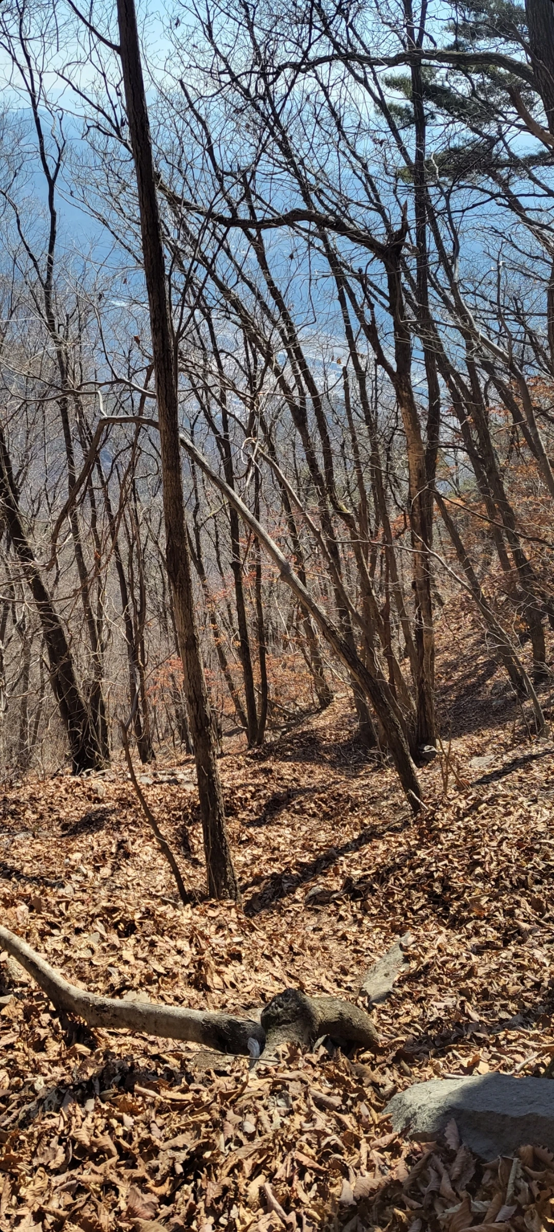 이리 큰 산에 큰 절이 없는 이유가 산에서 나는 샘물이 정력에 너무 좋아 이를 참아내는 스님들 없어서라는 믿거나 말거나 이야기에 계곡물이라도 한 잔 하려 했으나 봄가뭄에 모두 말라버려, 고드름이라도씹어야하나하다가단단해진 허벅지로 충분하다 혼자웃으며 그냥 통과합니다.