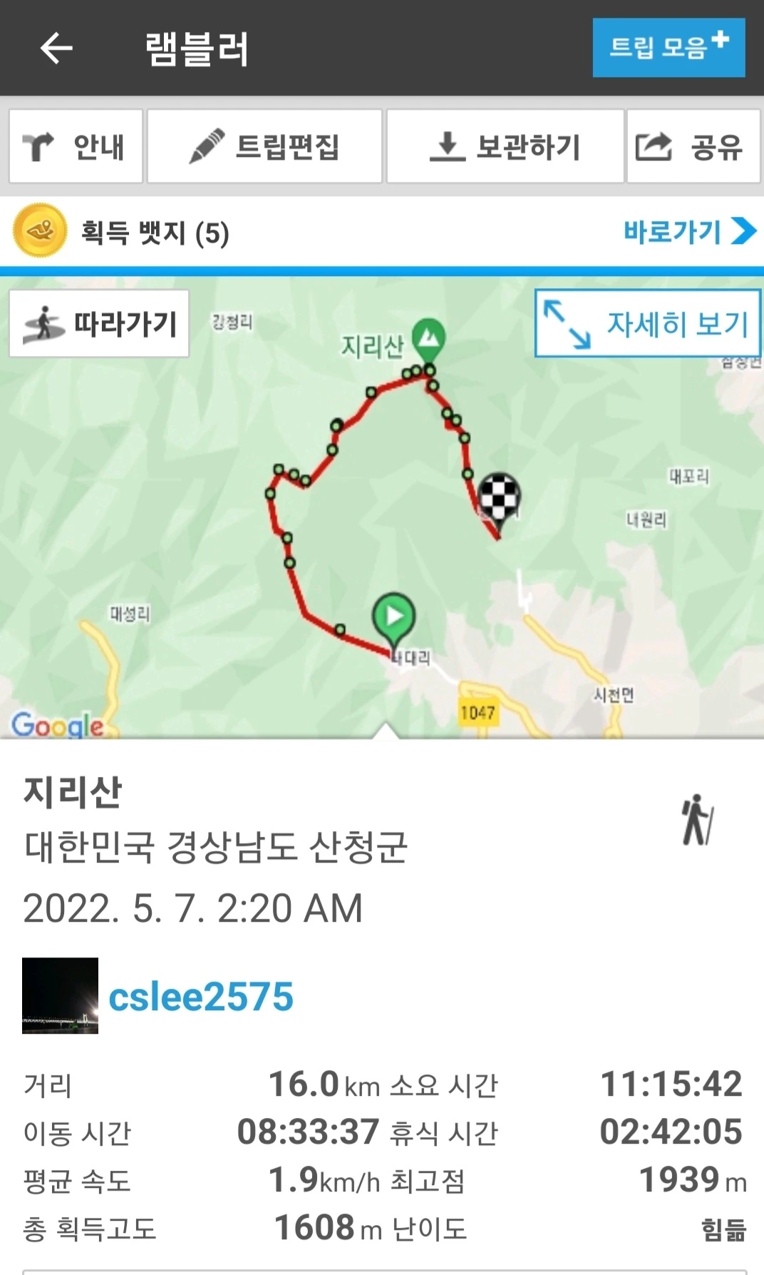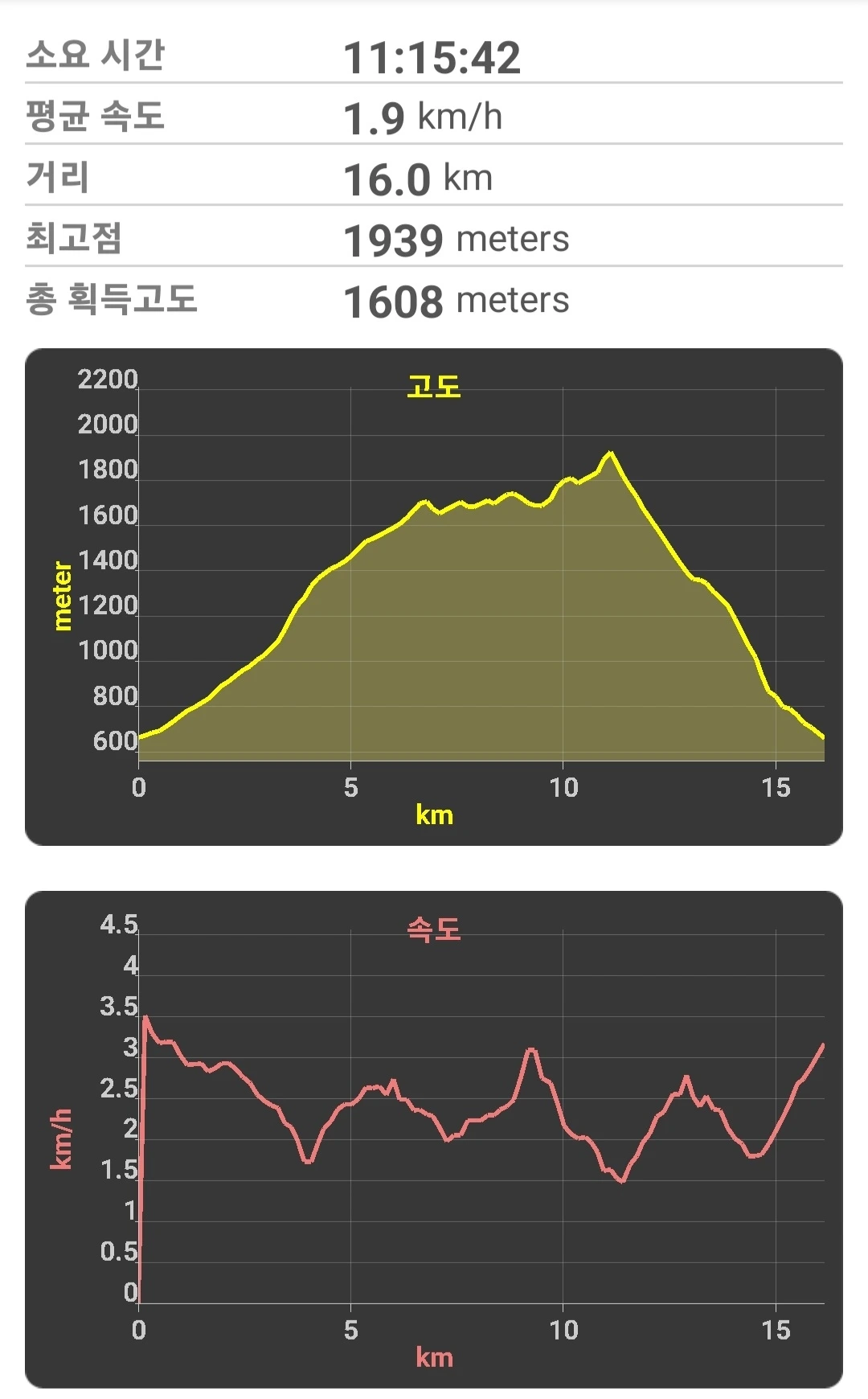 *거림탐방쎈터~세석대피소~촛대봉~연하선경~장터목산장~제석봉~천왕봉~법계사~로터리휴게소~칼바위~중산리탐방쎈터 총 16km 11시간의 힘들지만 멋지고 아름다운 산행이었습니다.