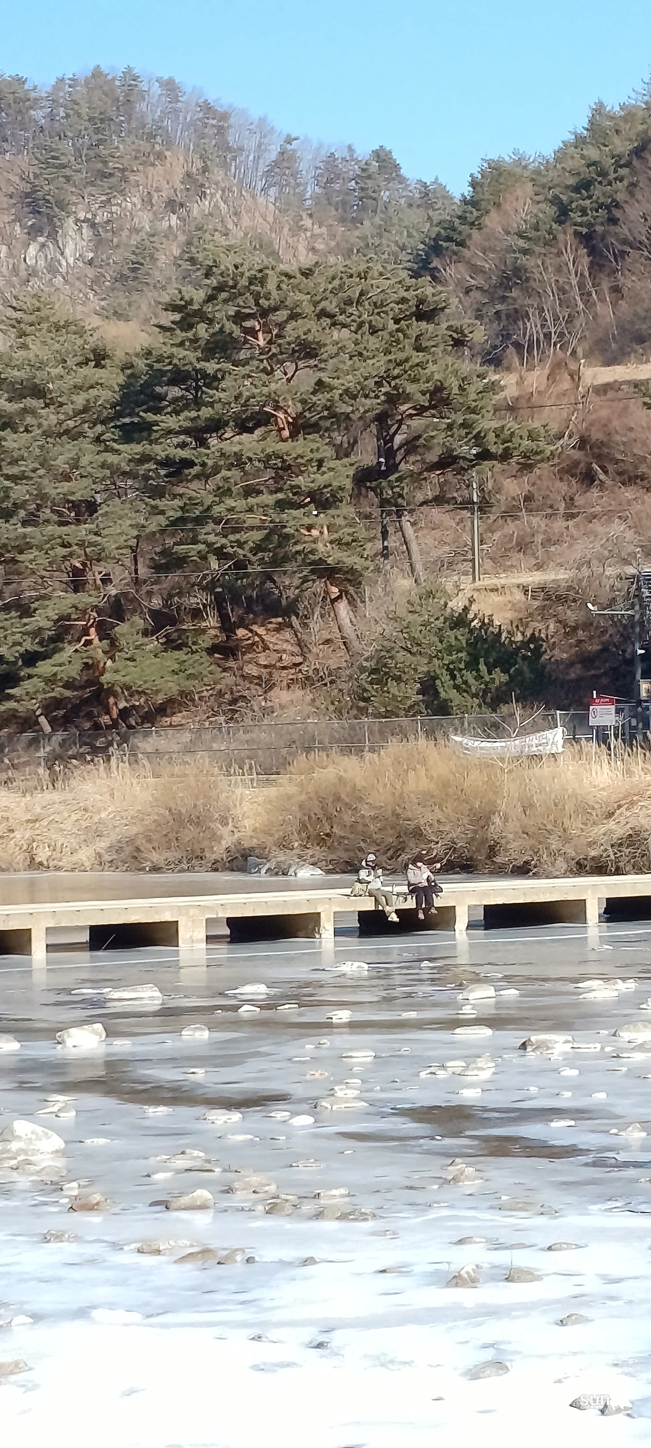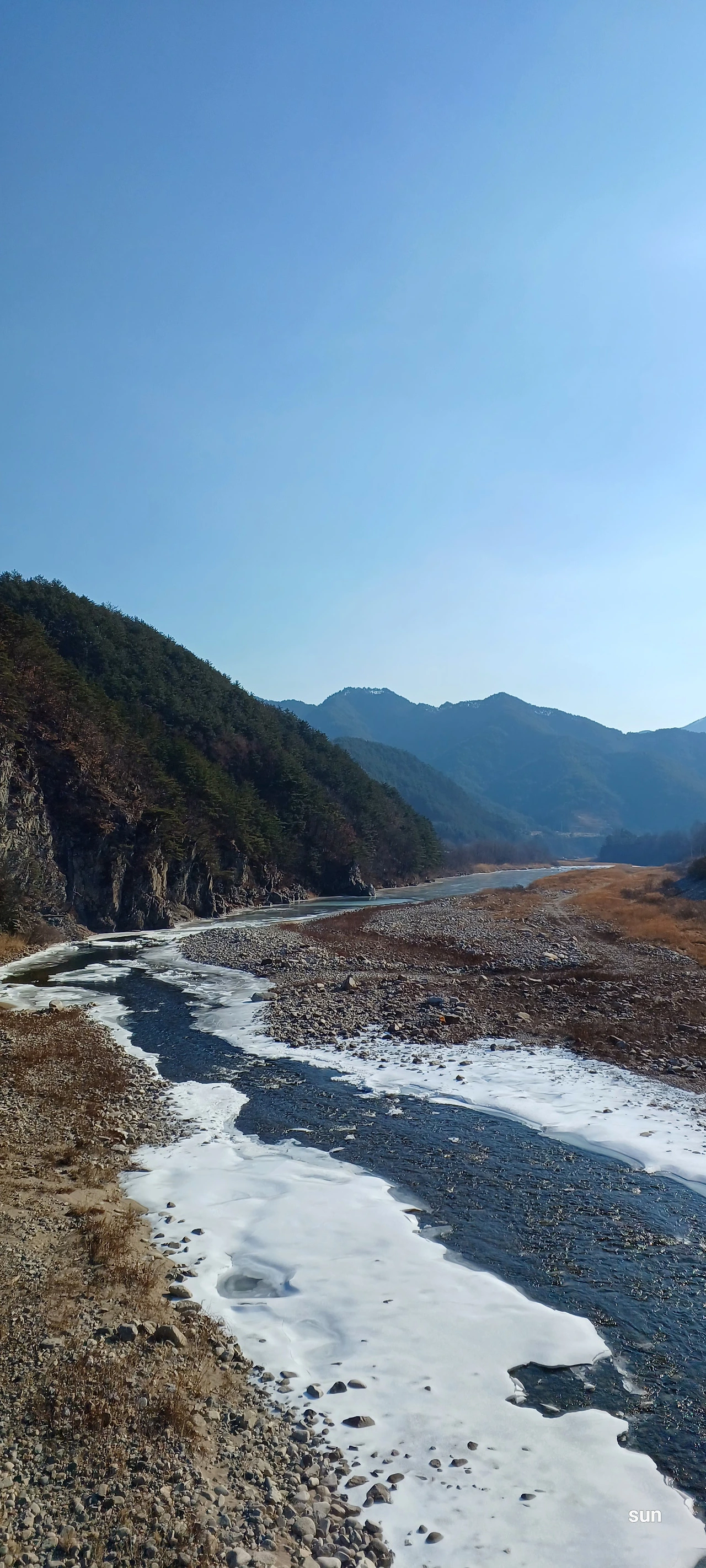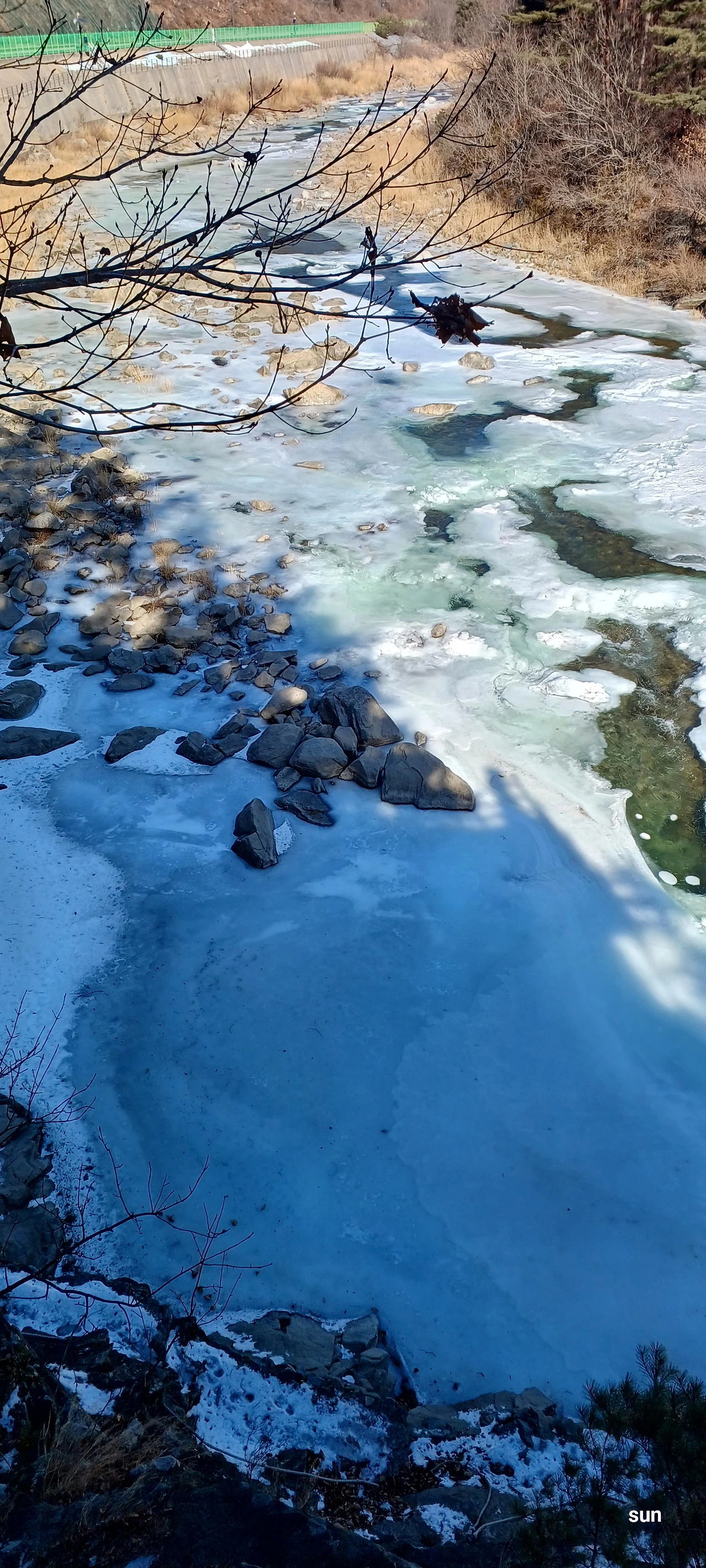 강바닥에 고여 얼음이 되는데