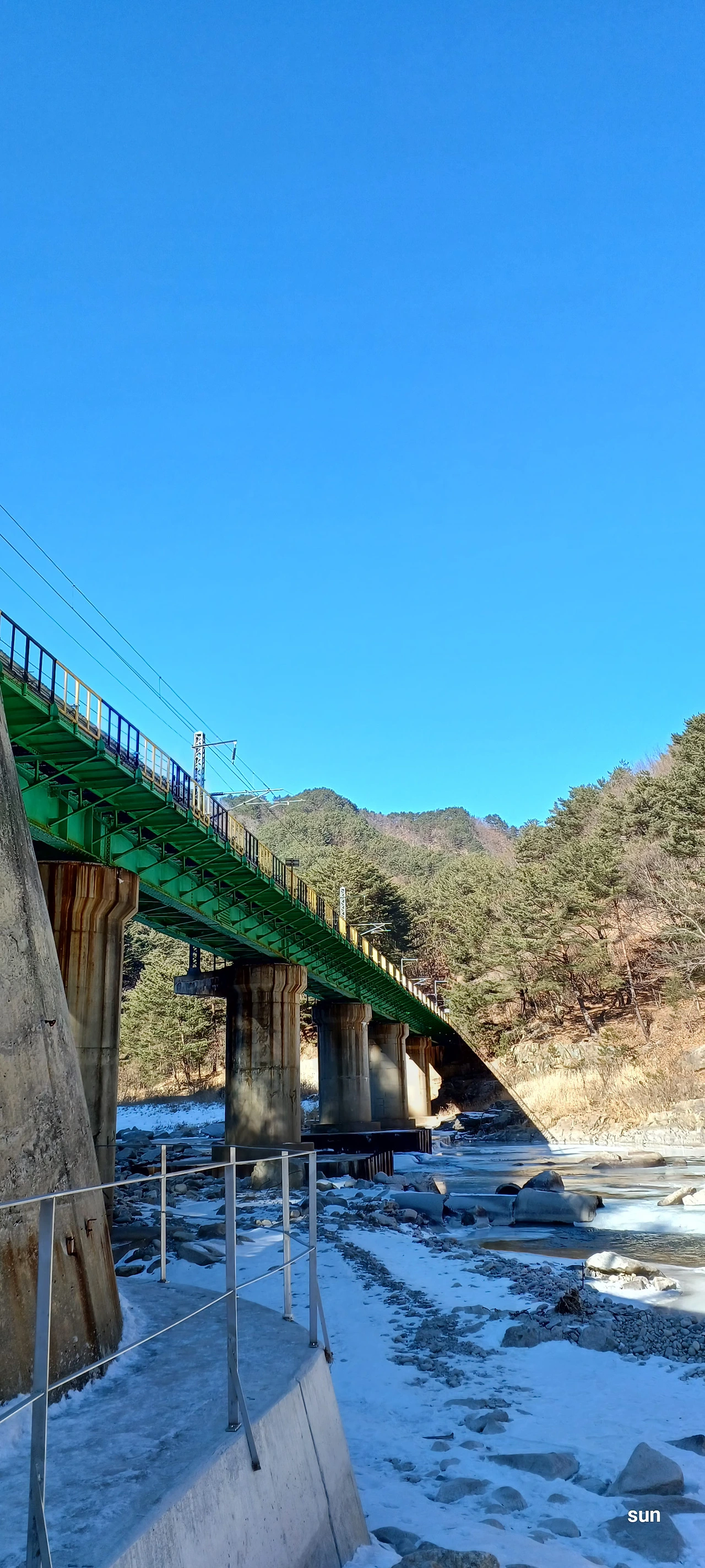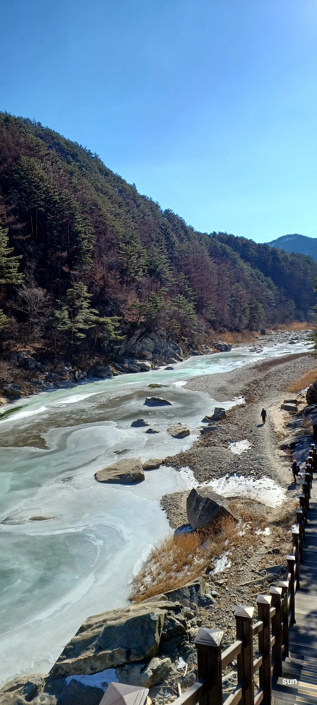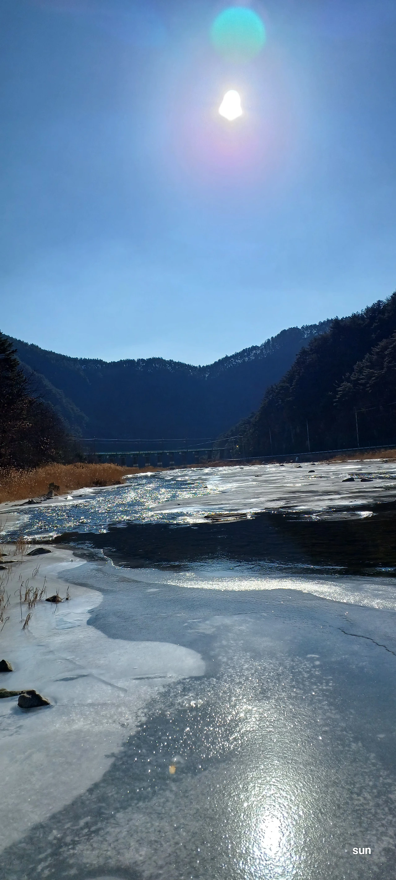 강바닥에 고여 얼음이 되는데
