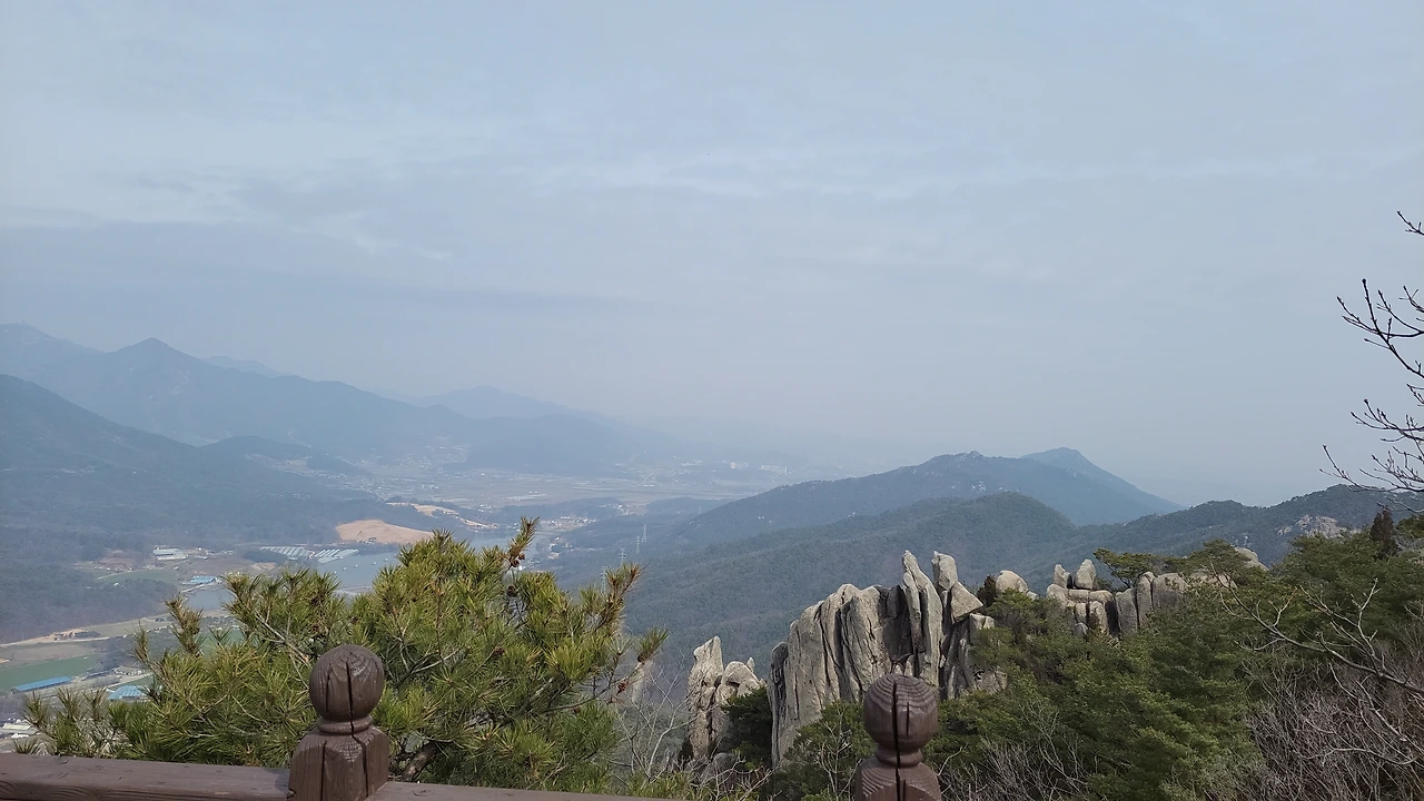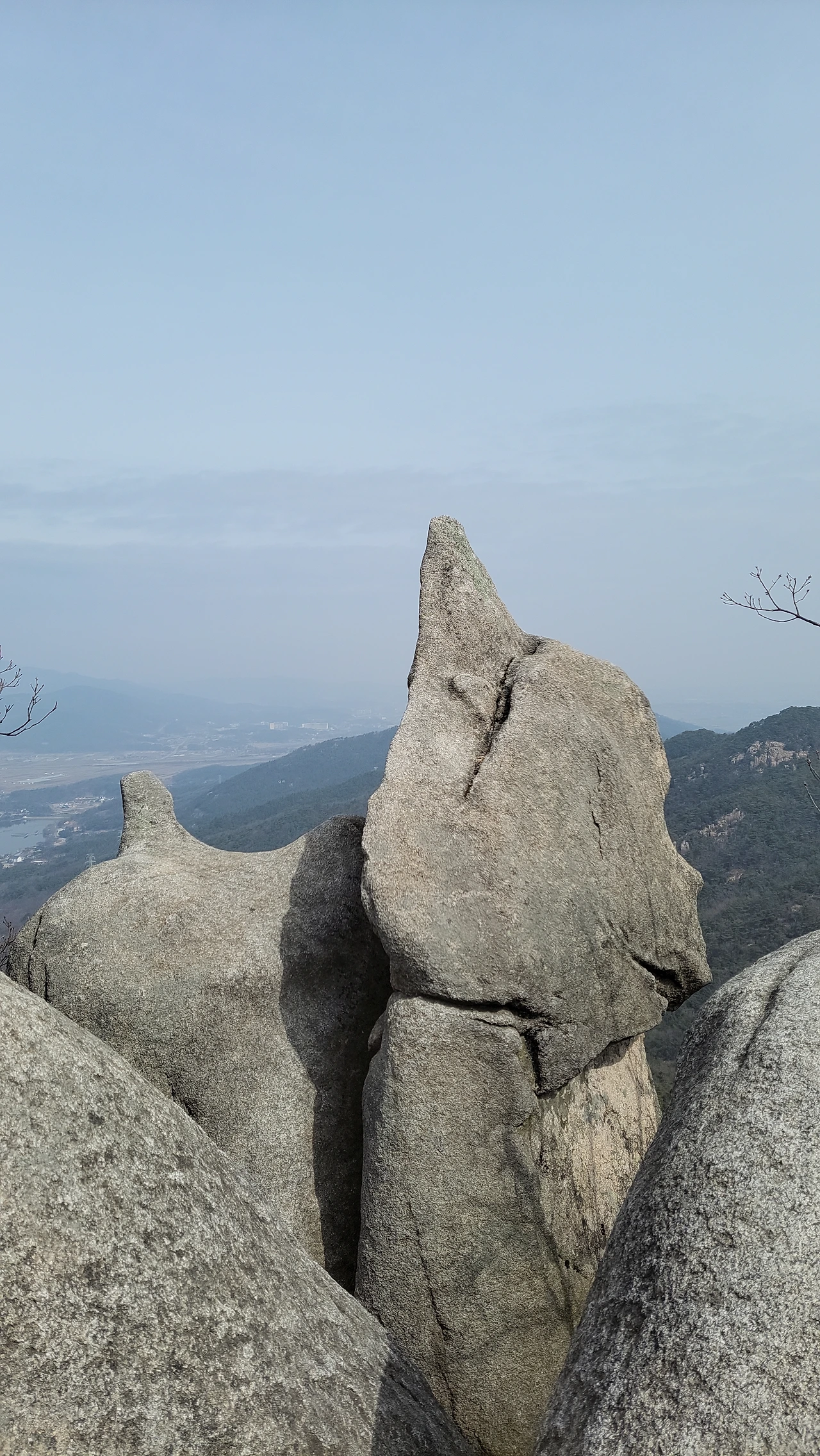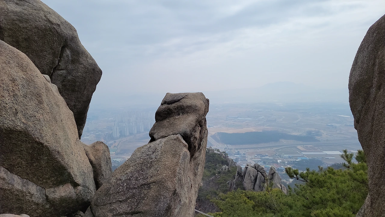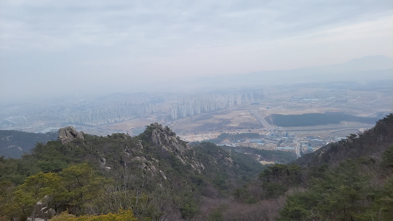 거대 불상과 만물 바위를 잠시 구경하고 흙과 암릉으로 이루어진 완만한 등산로를 오르다 뒤돌아 보니 광활한 평야와 멀리 큰 산들이 몇 개 눈에 들어오더군요.