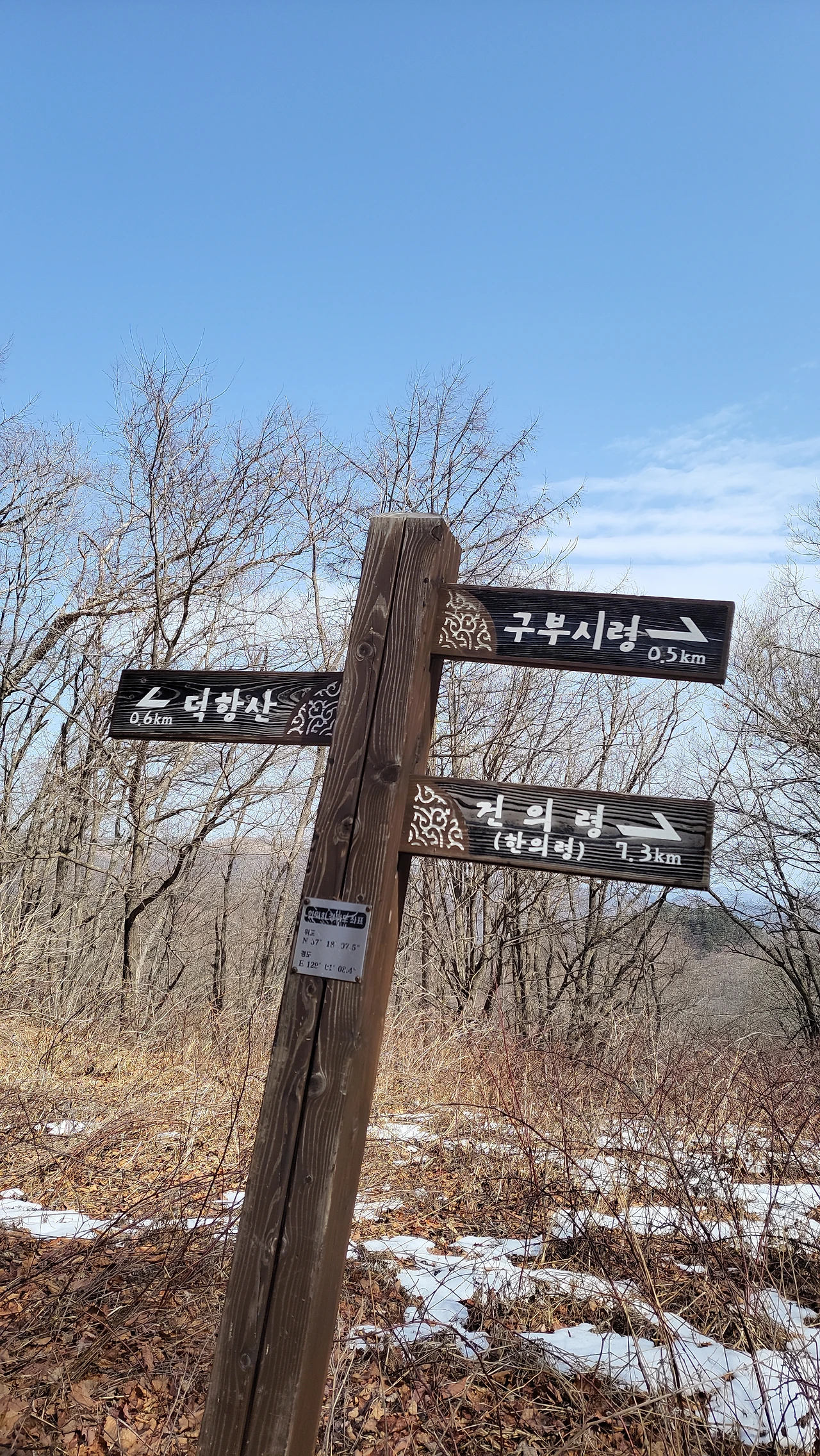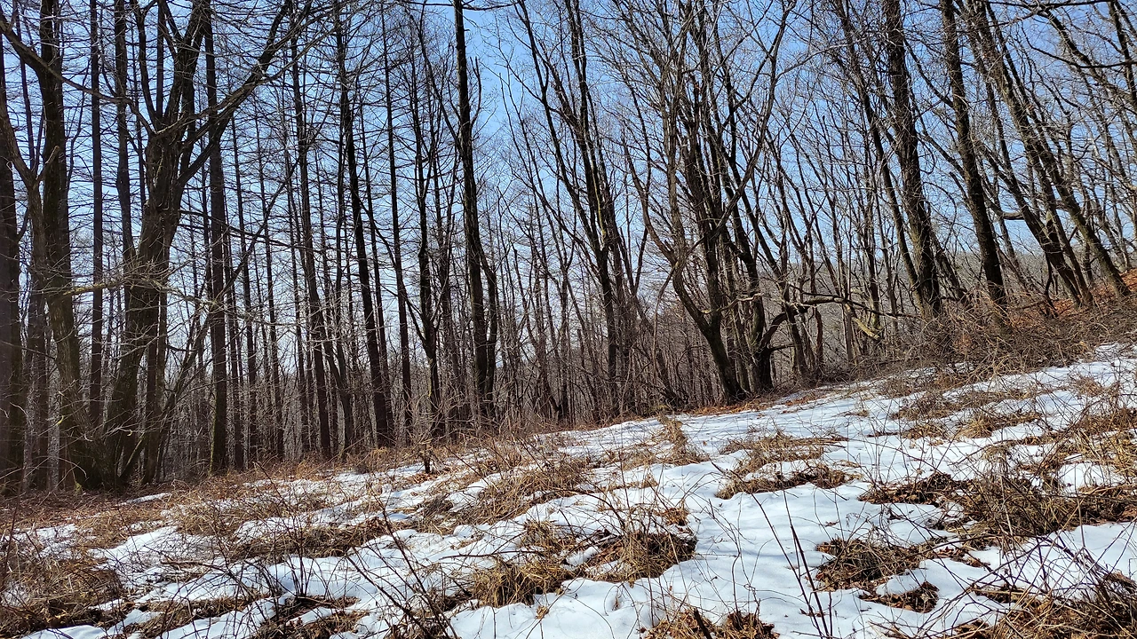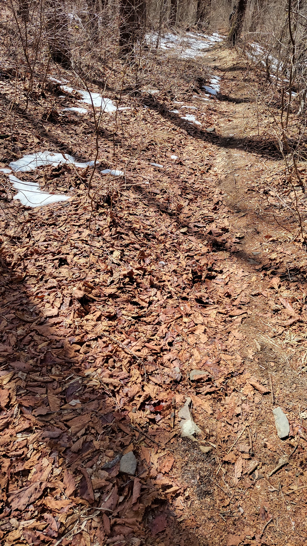 아랫녁과 북사면 음지는 눈이 한창이지만, 위로 오를수록 따듯한 햇살 덕분에 오히려 뽀송뽀송한 낙엽 길이 이어졌습니다.