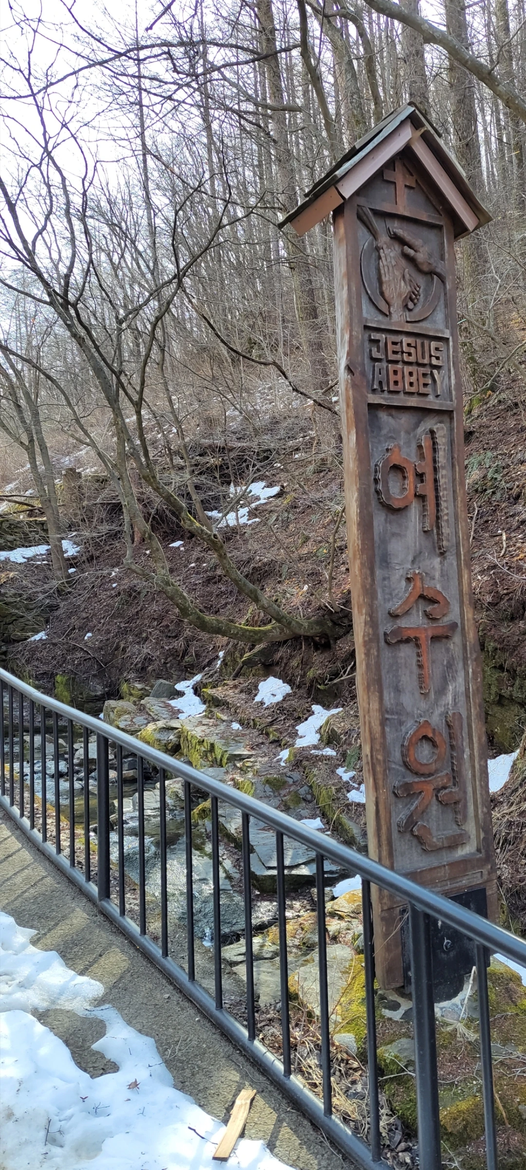 아직 얼어 있는 계곡을 따라 포장도를 10여 분 걷다 보면 좌측으로 아담한 예수원 건물이 나타납니다.