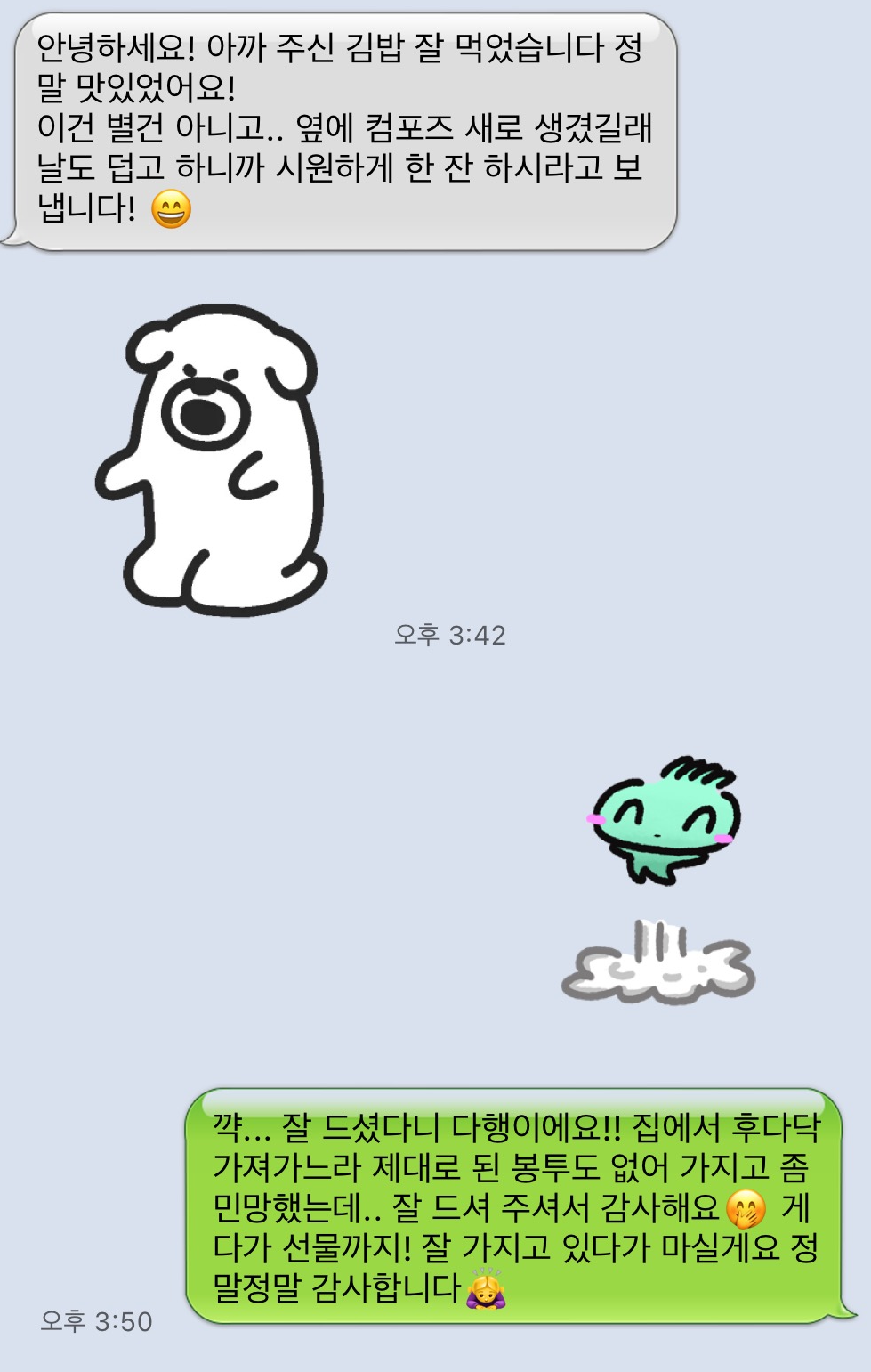 그리고~ 김밥이 많이 남길래 오늘 알바하시는 분께 조금 나눠 드렸거든요? 그랬더니 카톡이 왔어요!
