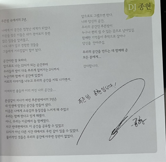 문득 그가 어떤 노래를 좋아했는지 궁금해지기도 하면서, 푸른밤 시절의 그의 사진을 보고 싶기도 했다.