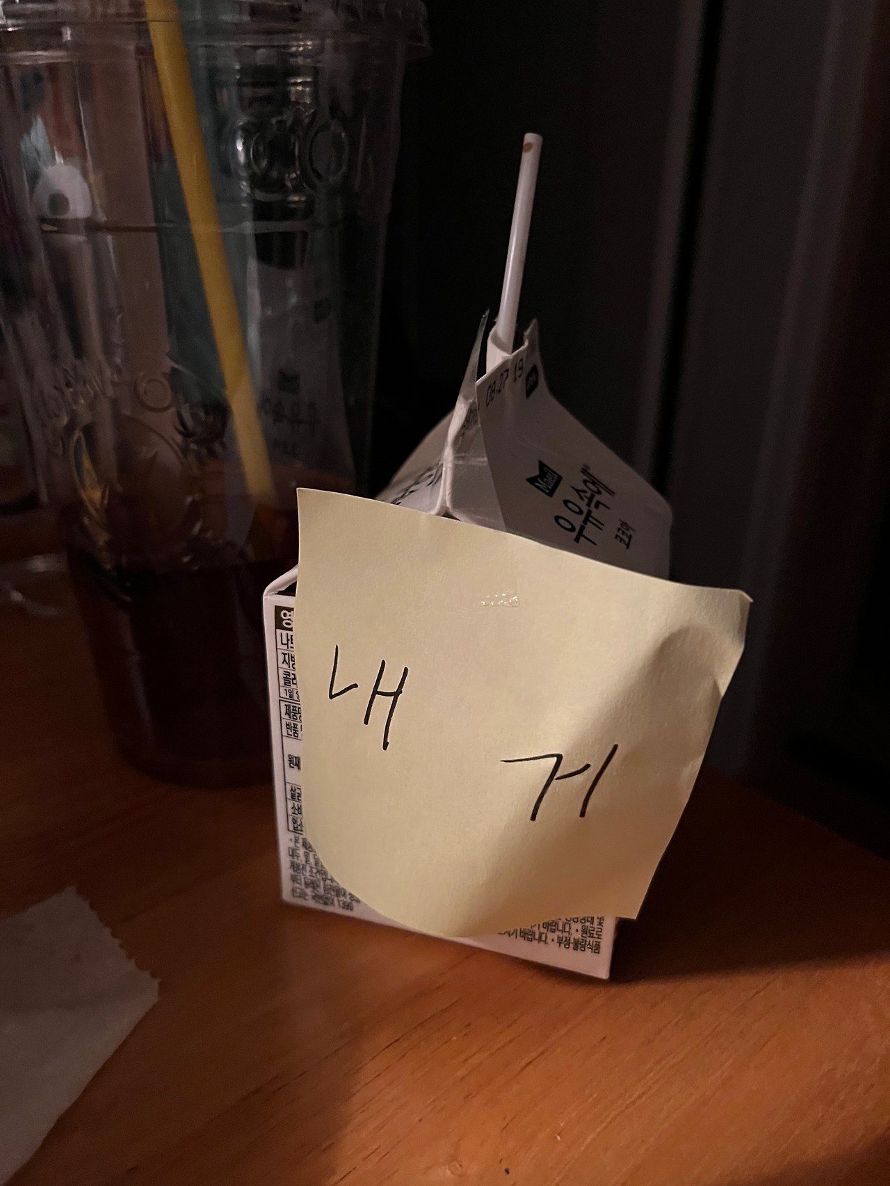 전 우유를 한번에 안 먹고 자기 전에 먹었다가 아침에 일어나서 또 먹고 그러는데, 빨대만 꽂아서 냉장고에 넣으면 엄마가 바로 버려 버리드라고요. 그래서 냉장고에 넣을 땐 꼭 내 거. 라고 써야 합니다. 엄마 미워잉
