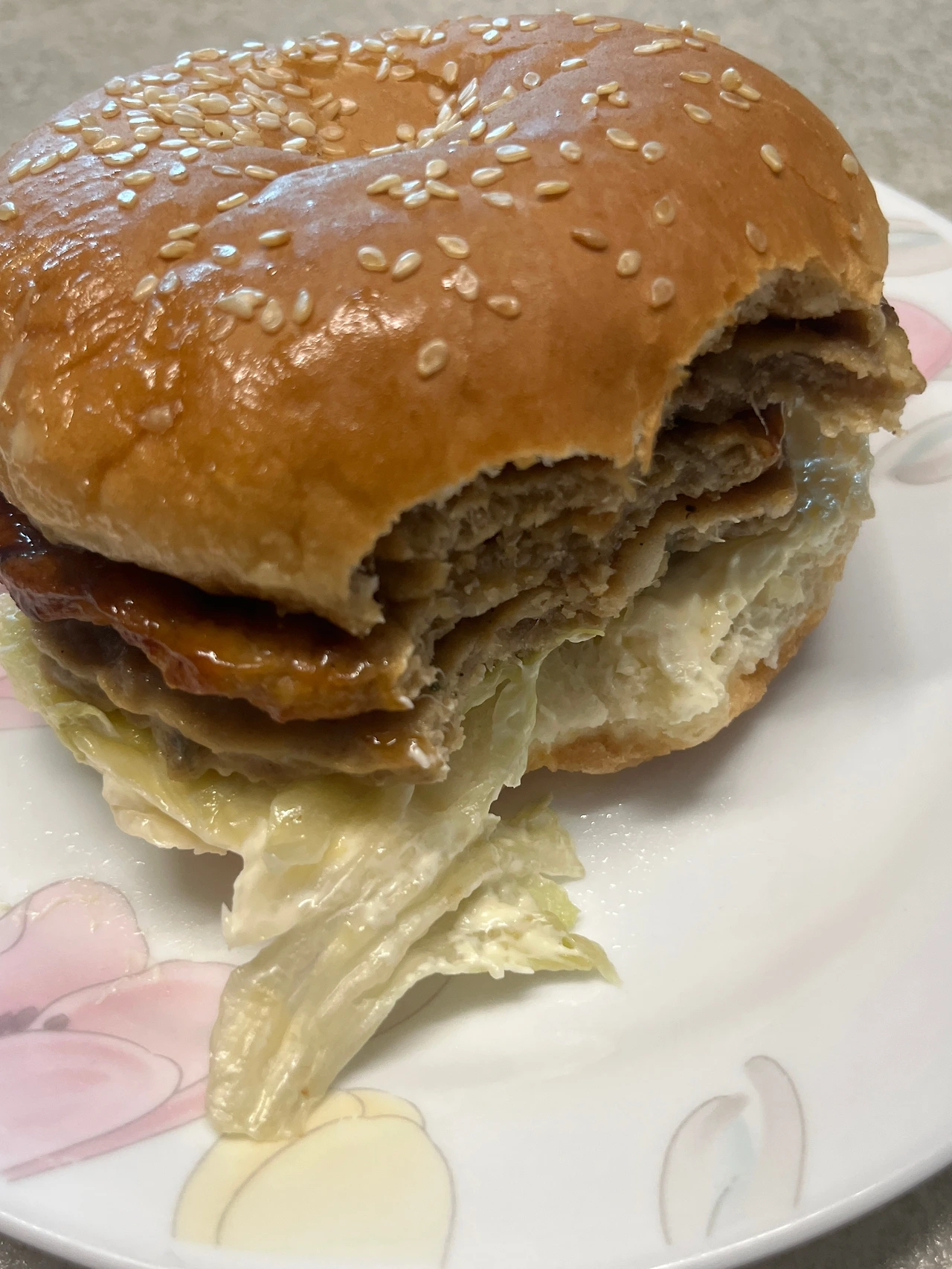 나름(?) 피클과 양상추도 갖추고 있습니다. 패티도 정말 세 장이네요. 굿. 좋은 점심이 되겠네요.